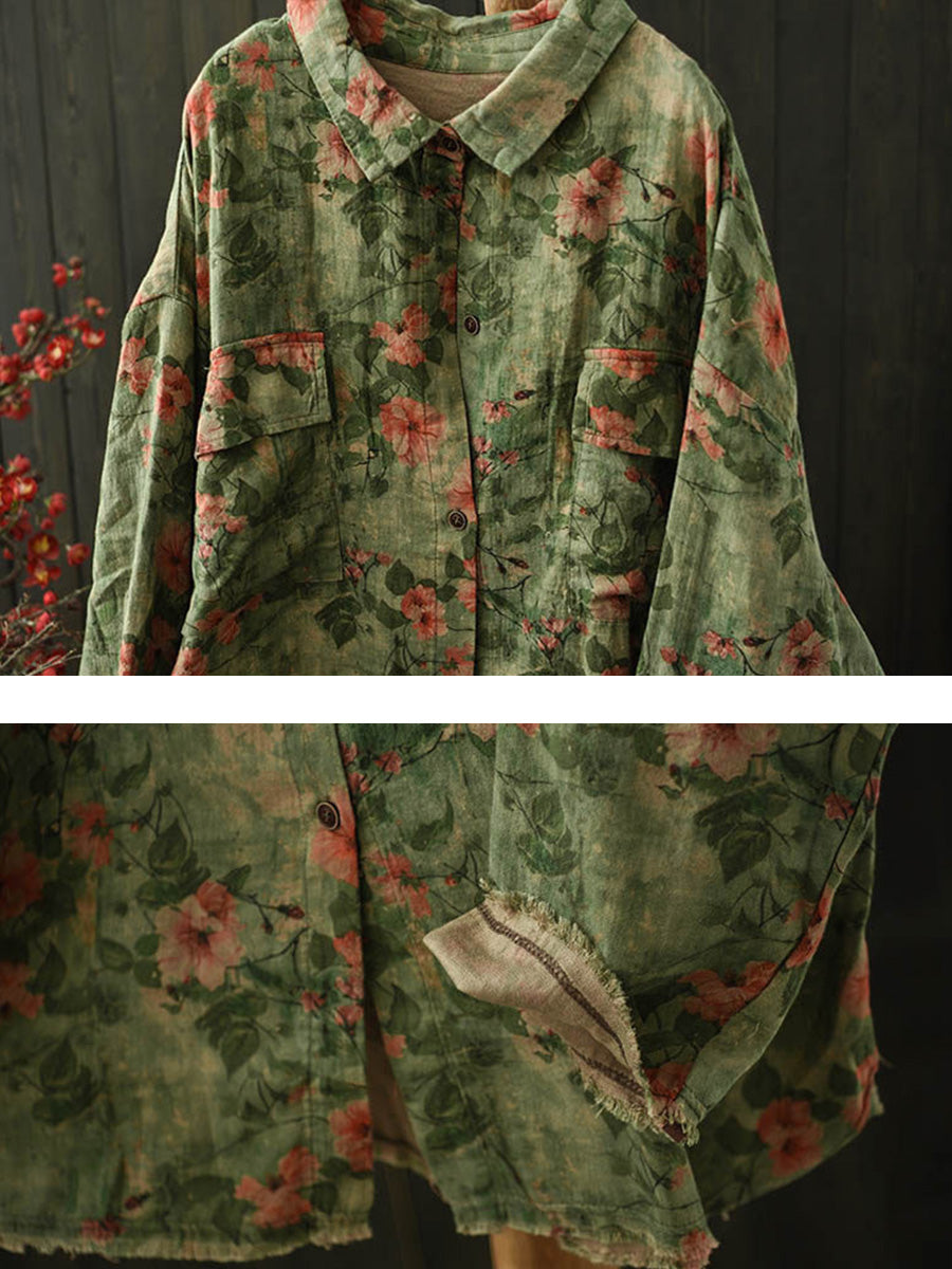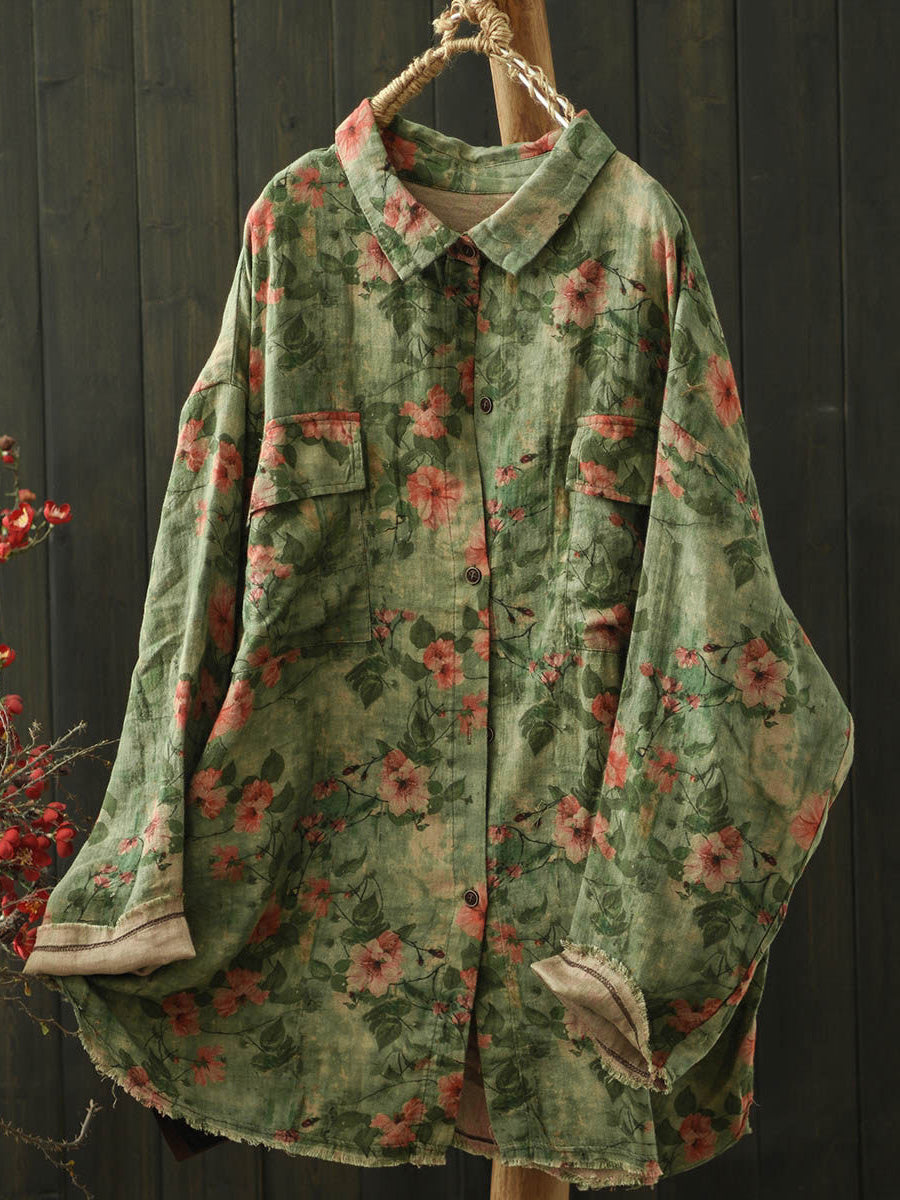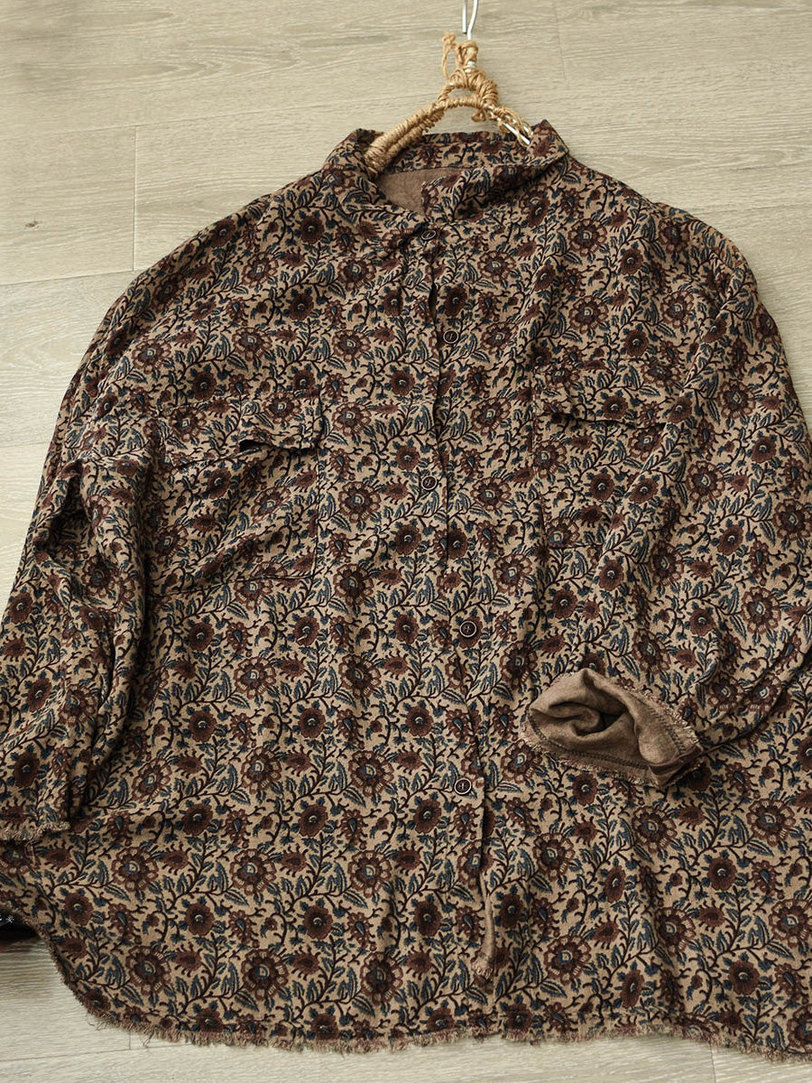 Women Winter Artsy Floral Turn-down Collar Cotton Shirt
