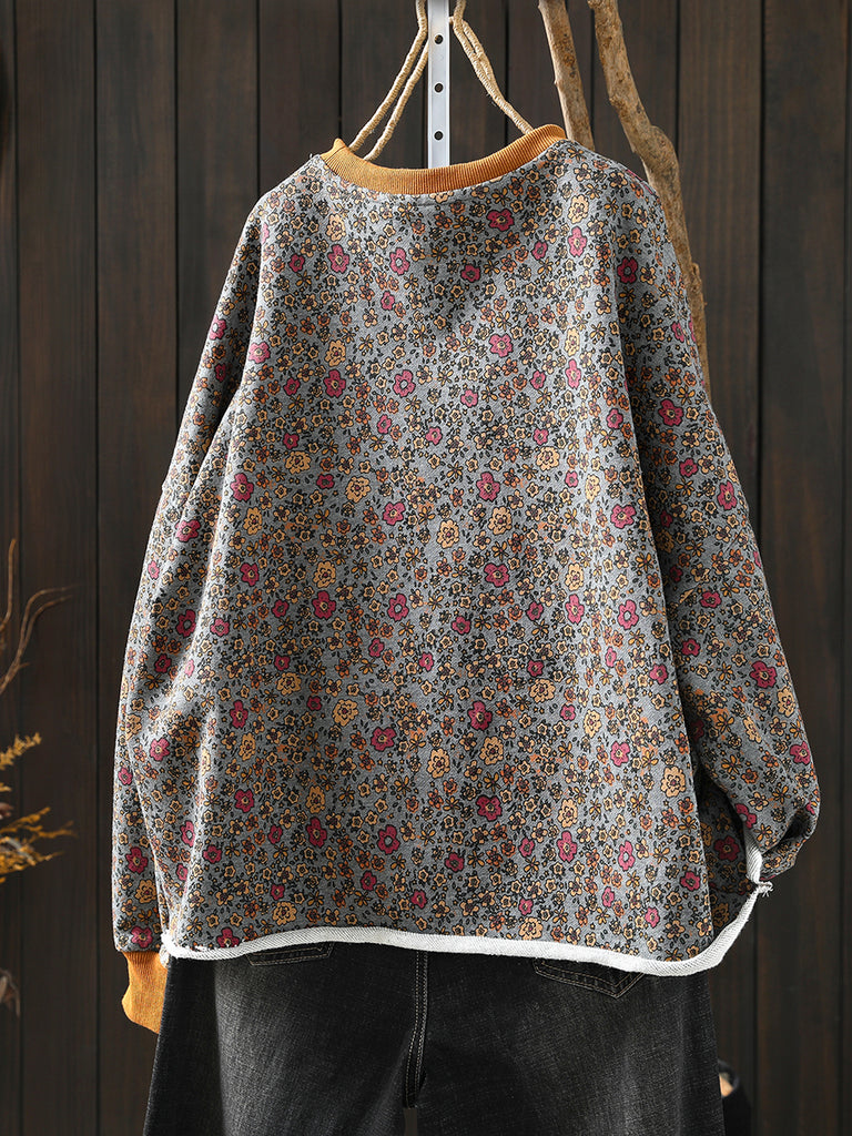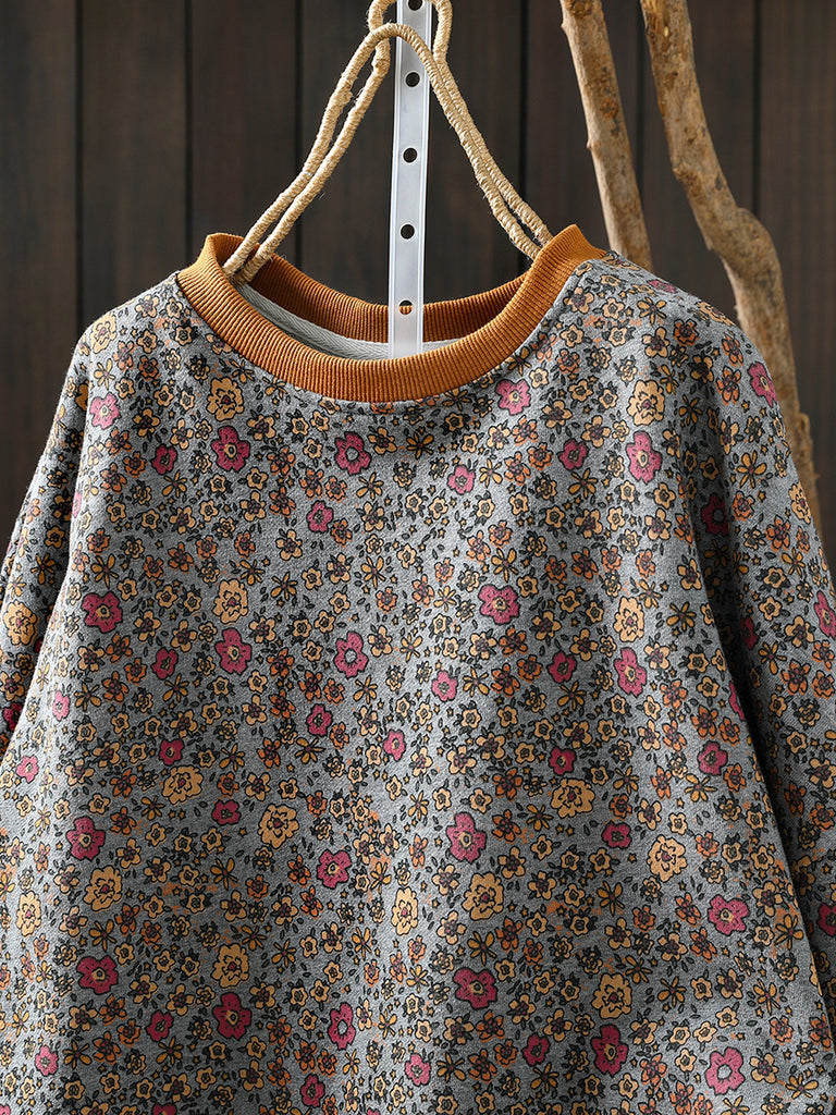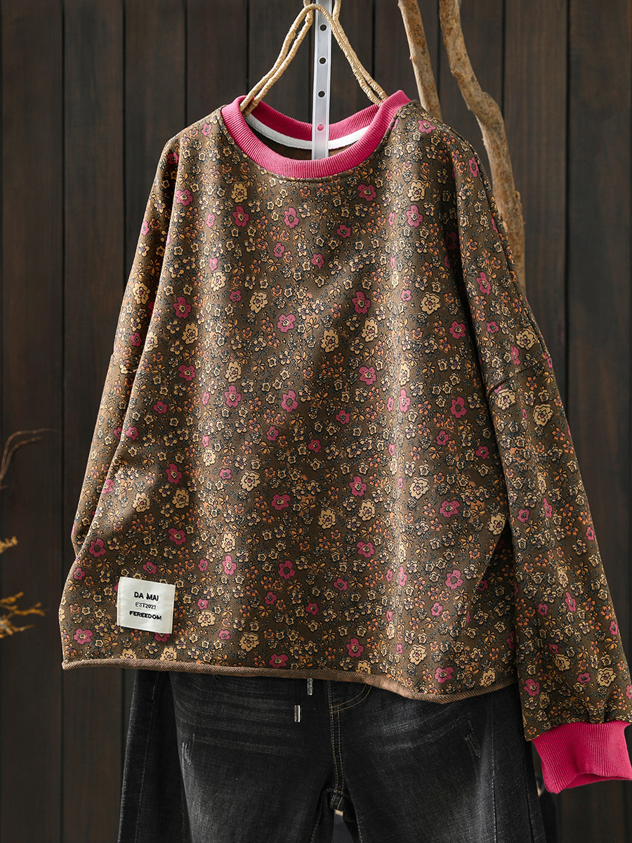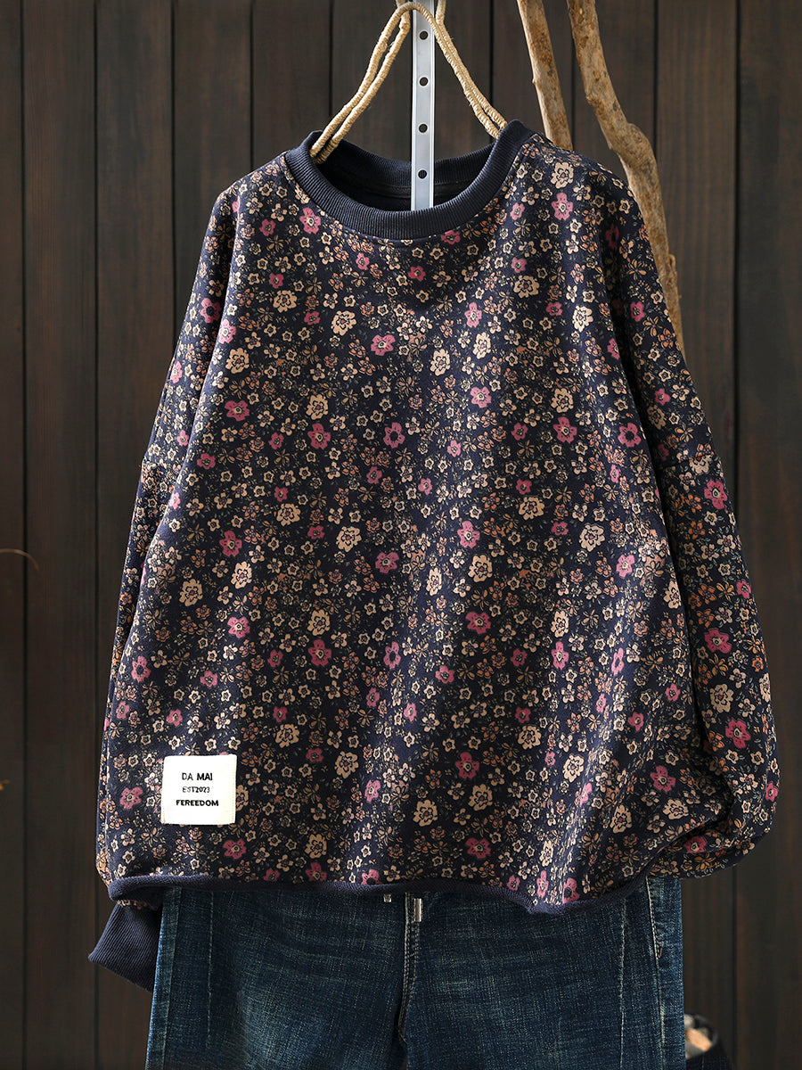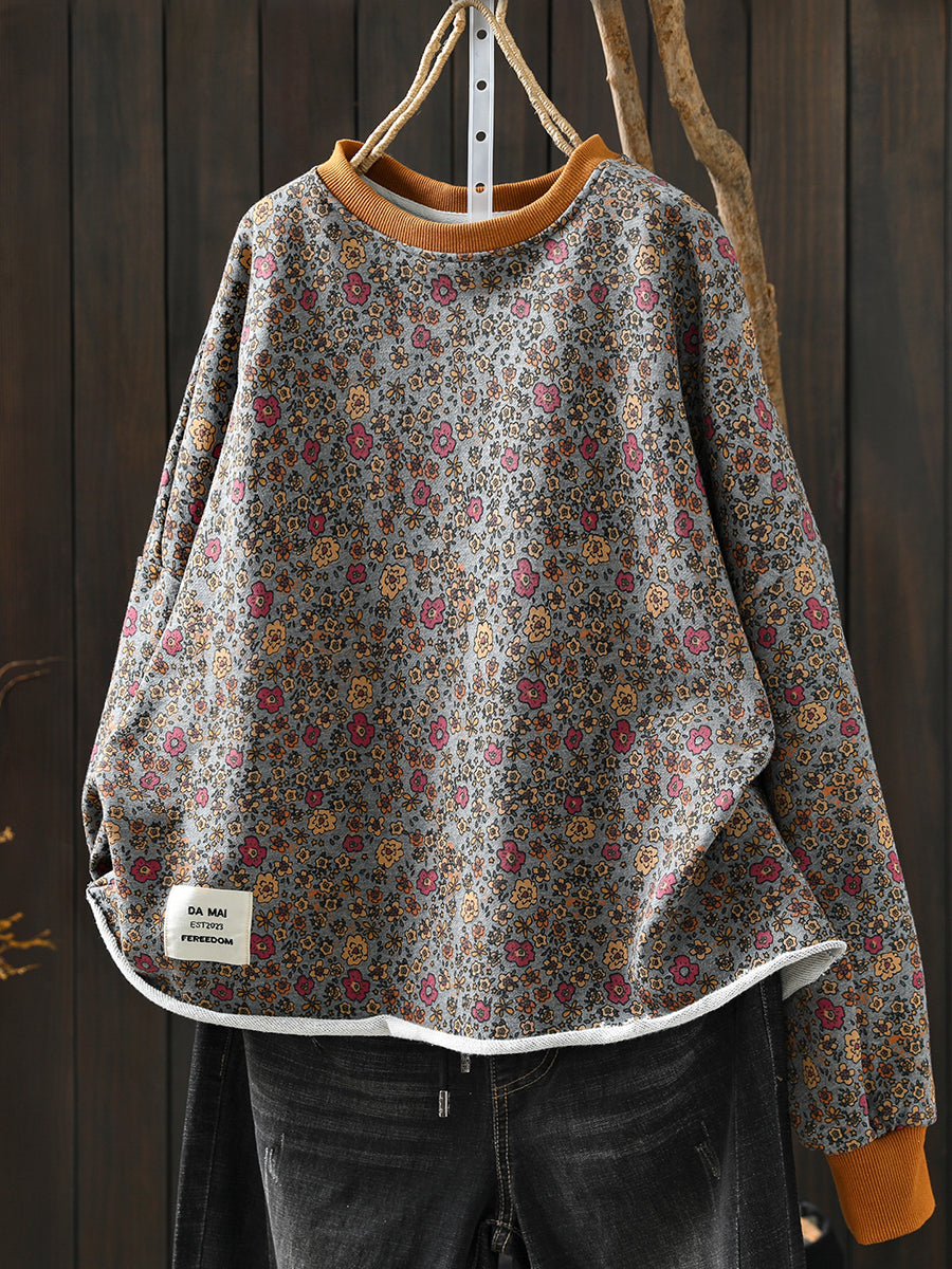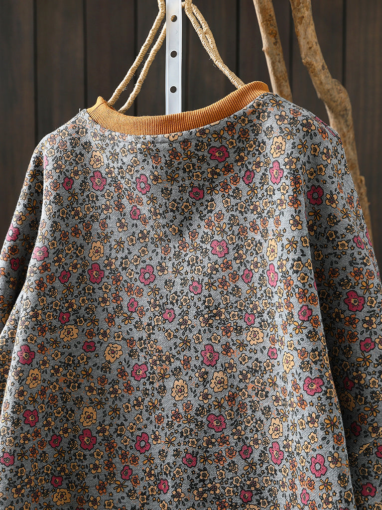 Women Winter Artsy O-Neck Floral 100%Cotton Blouse