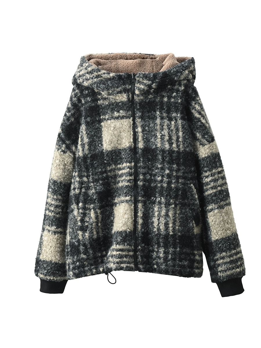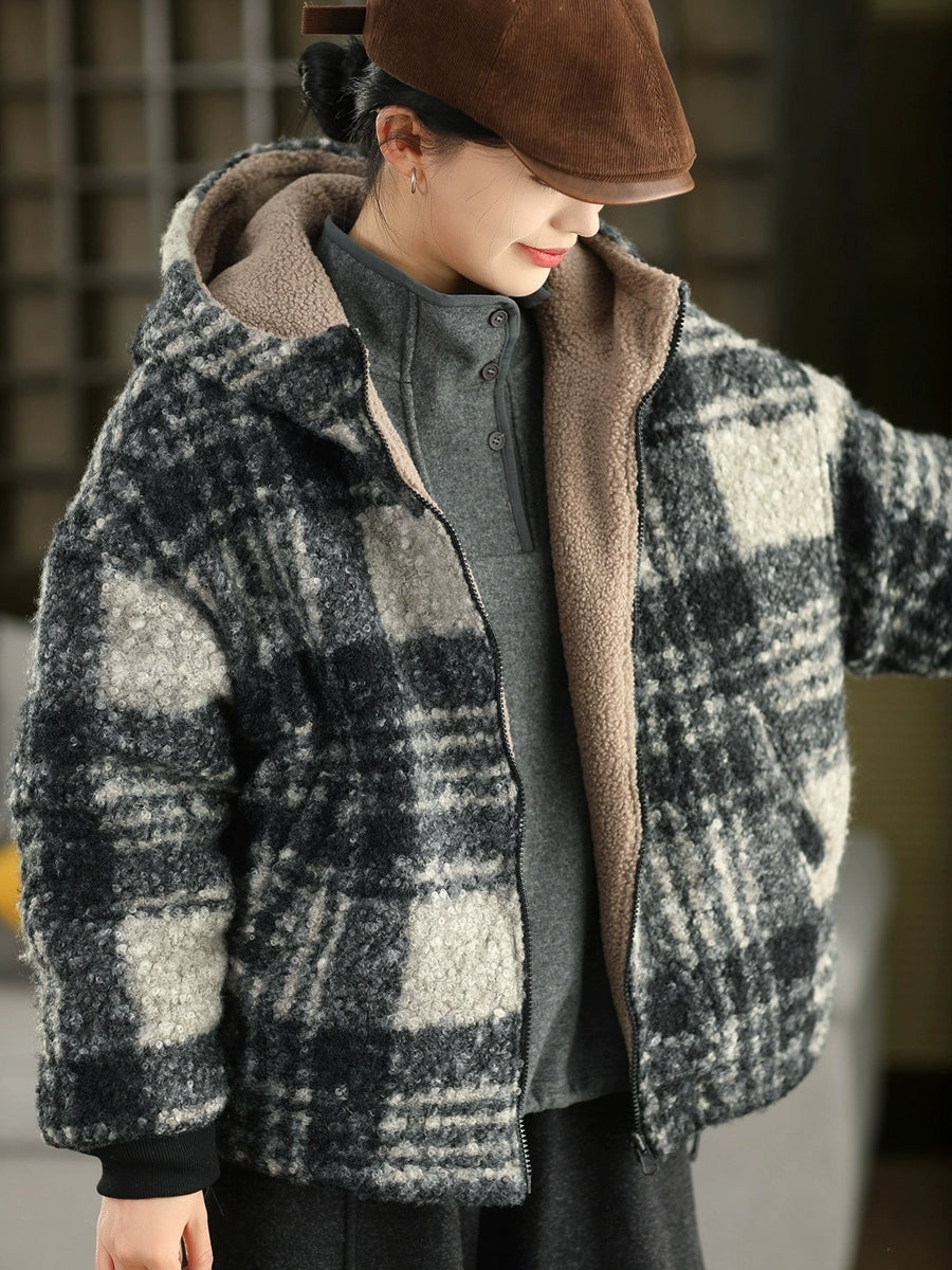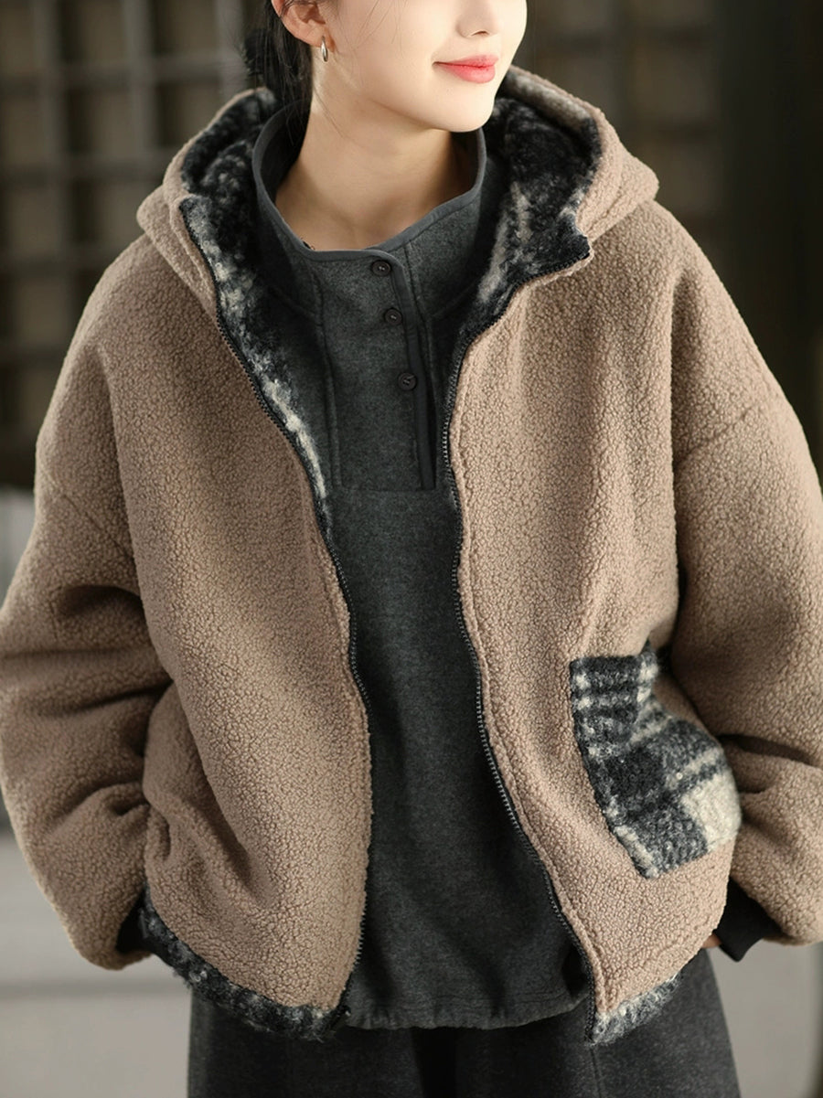 Women Winter Artsy Plaid Fleece Dual-side Wearing Hooded Coat