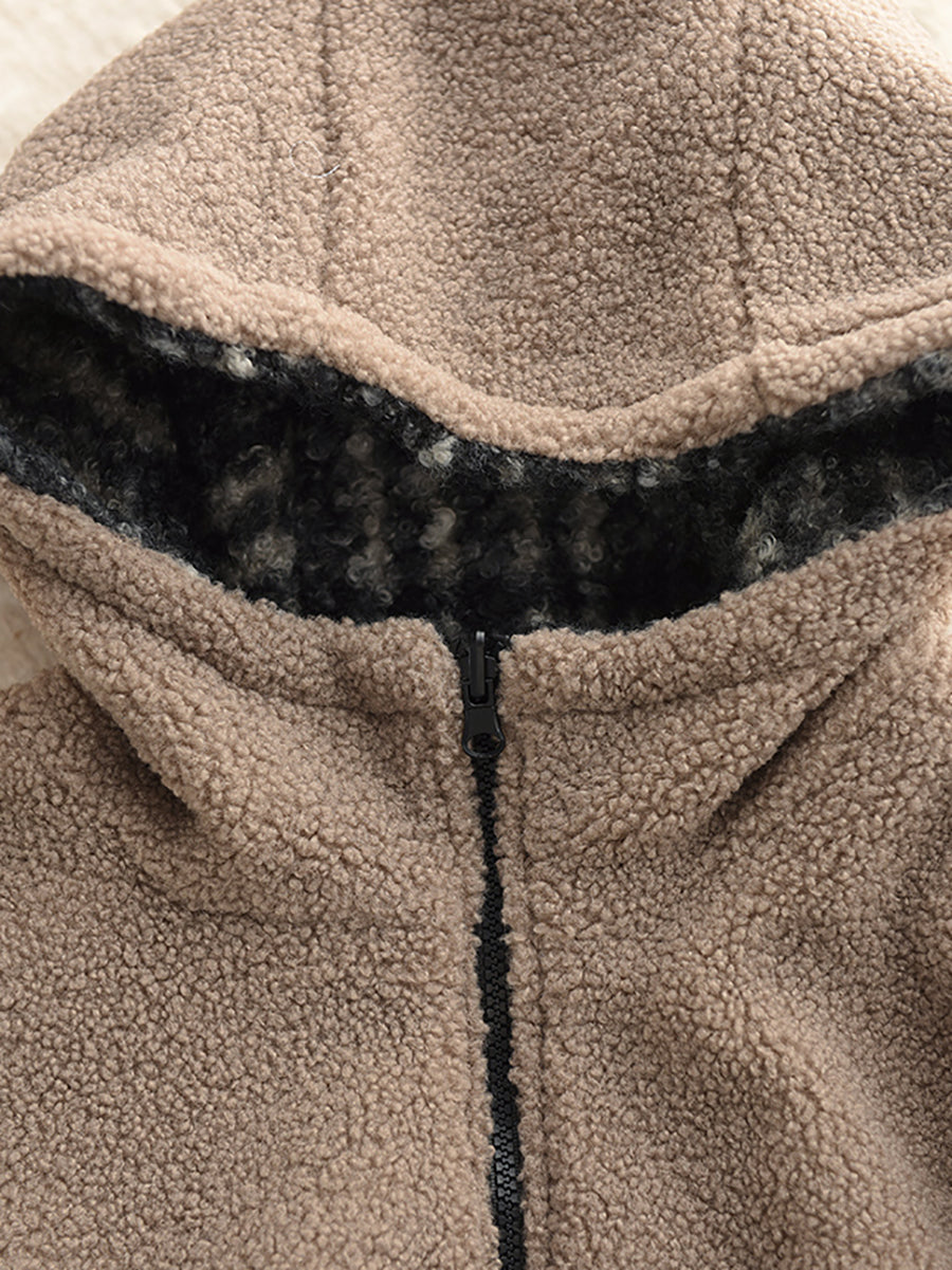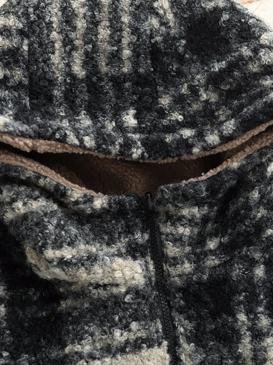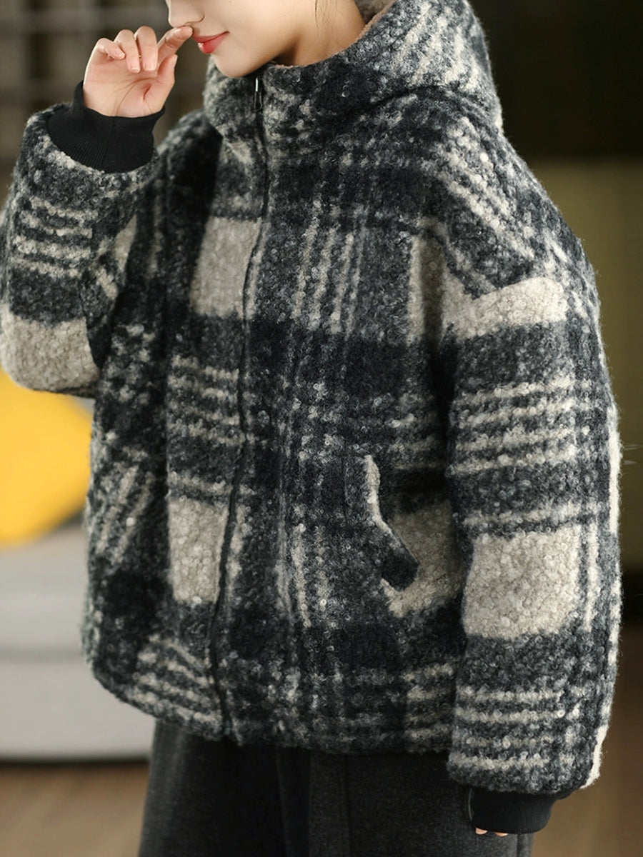 Women Winter Artsy Plaid Fleece Dual-side Wearing Hooded Coat