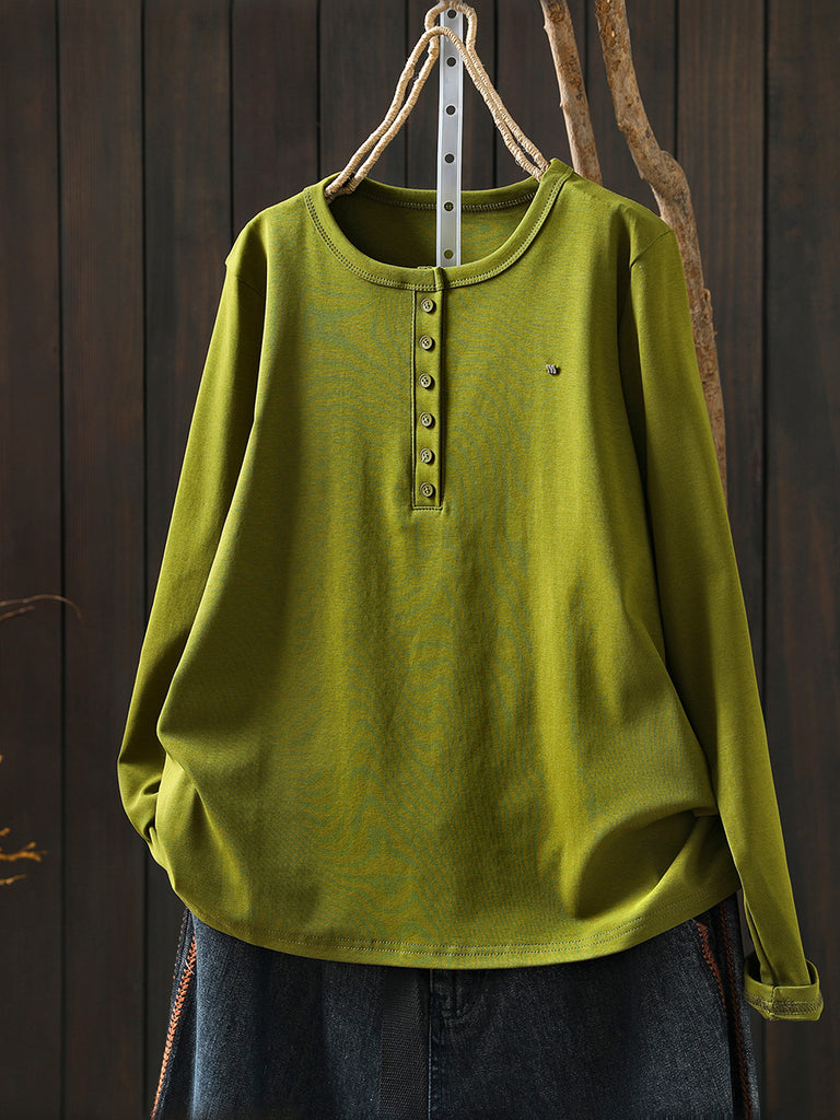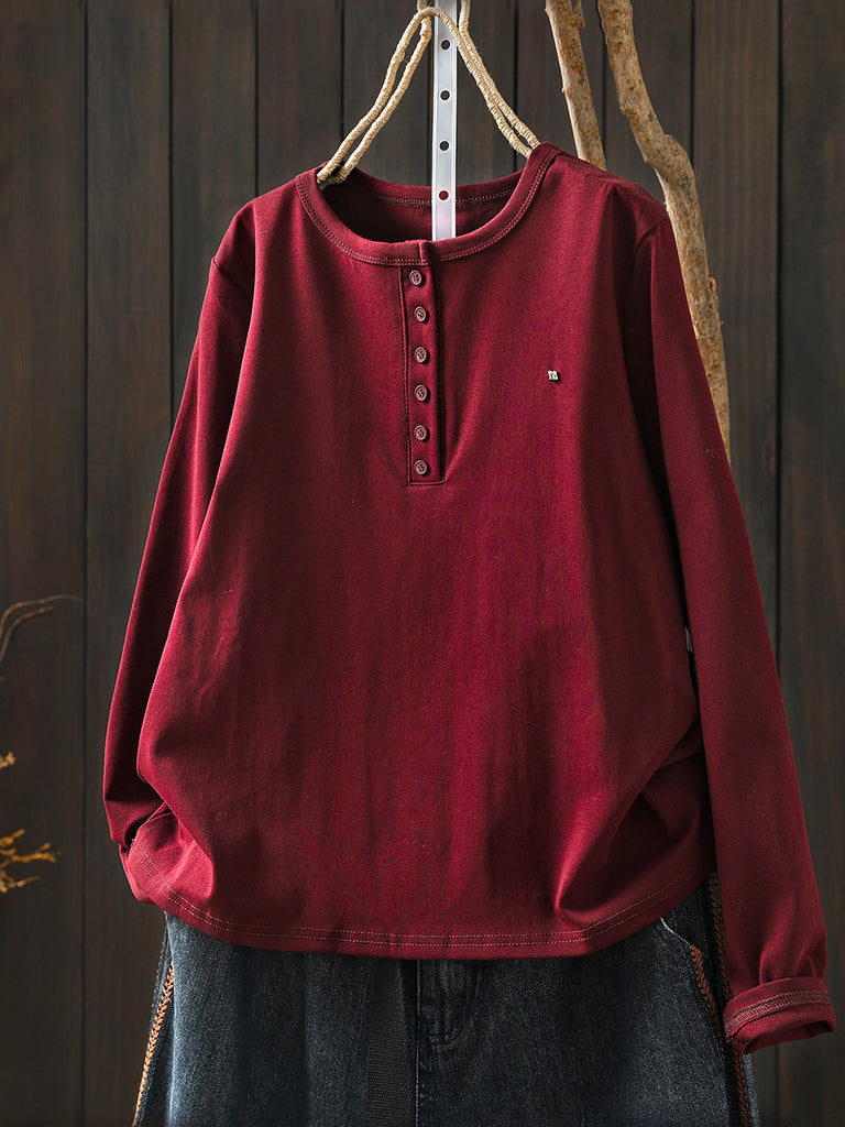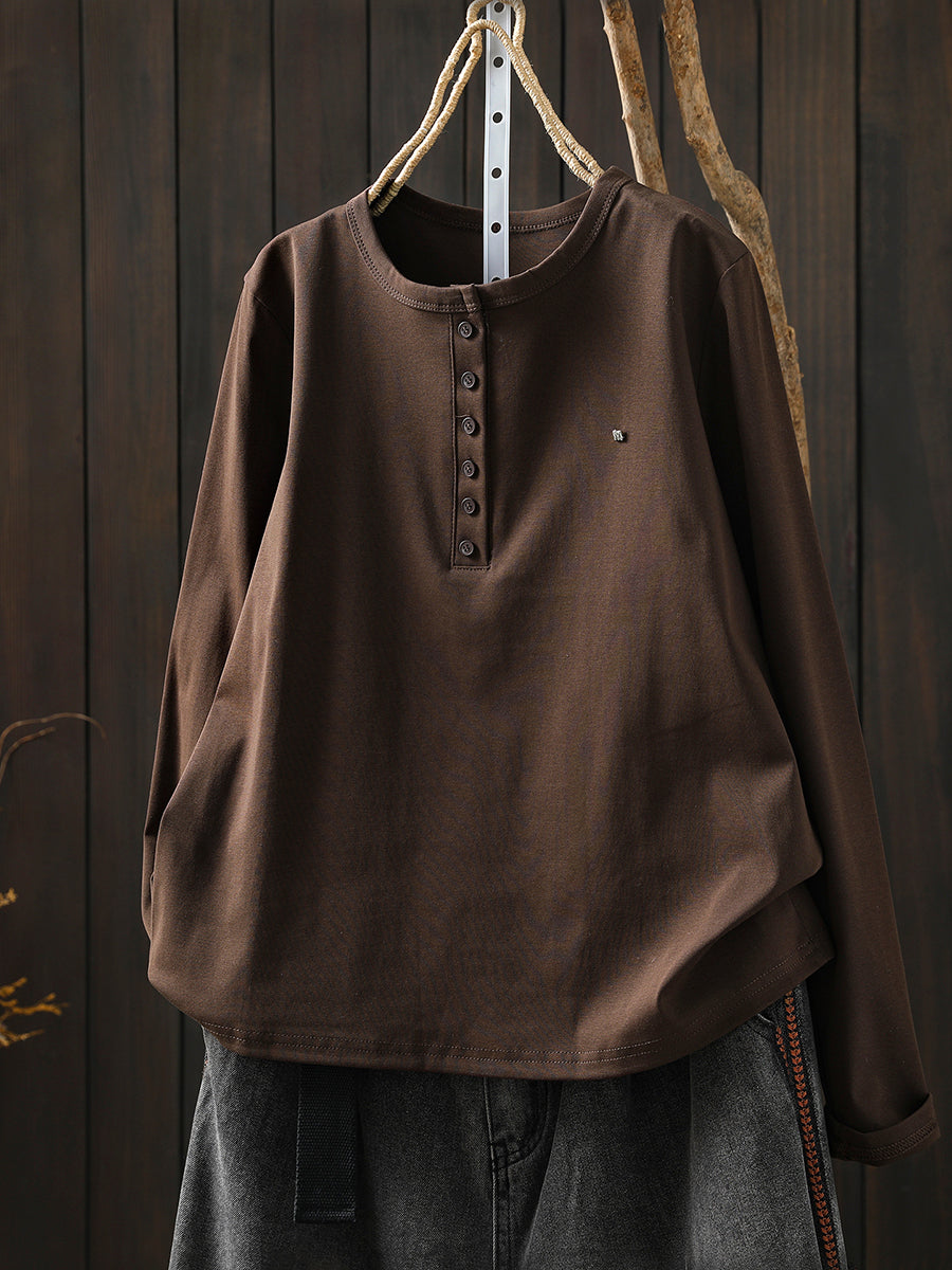 Women Winter Artsy Pure Color O-Neck Cotton Blouse
