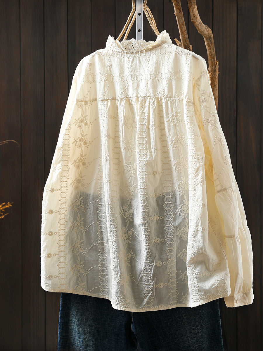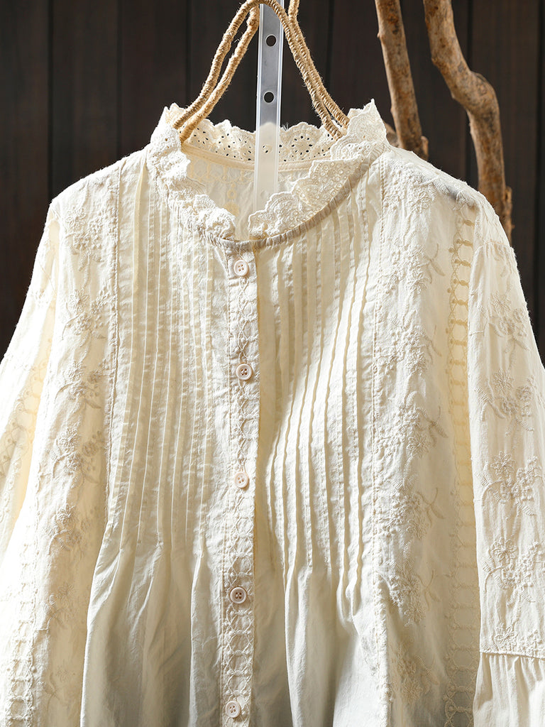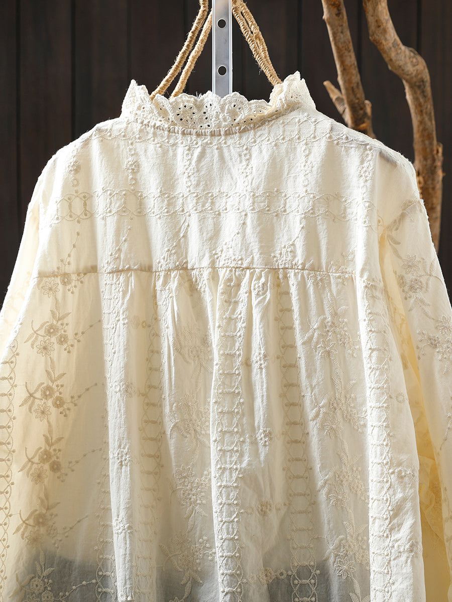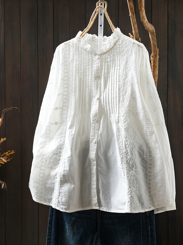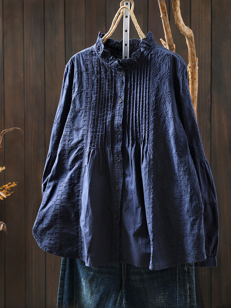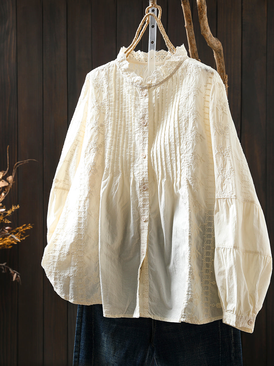 Women Winter Artsy Stand Collar Embroidery 100%Cotton Shirt