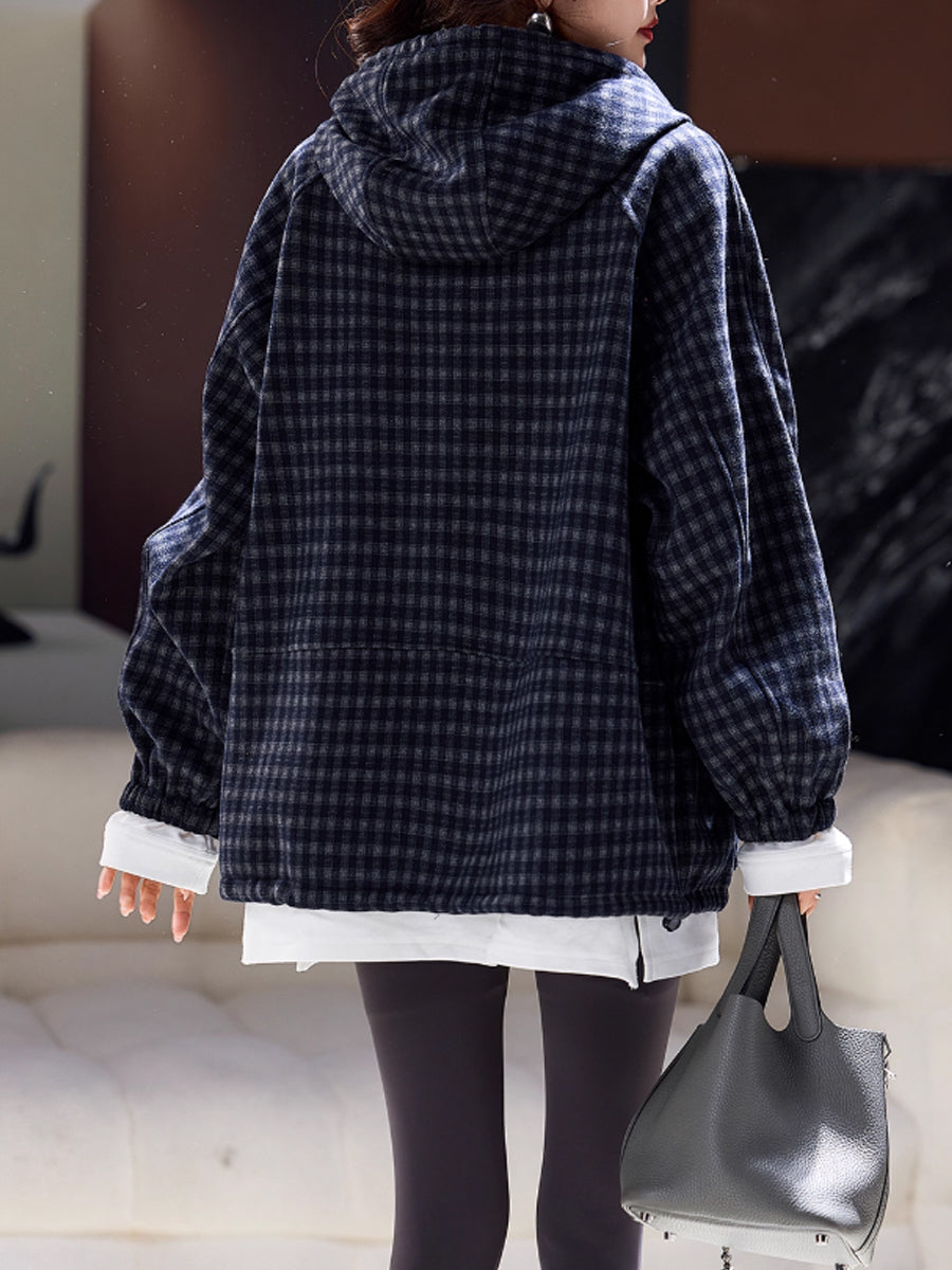 Women Winter Casual Plaid Fleece-lined Hooded Padded Coat