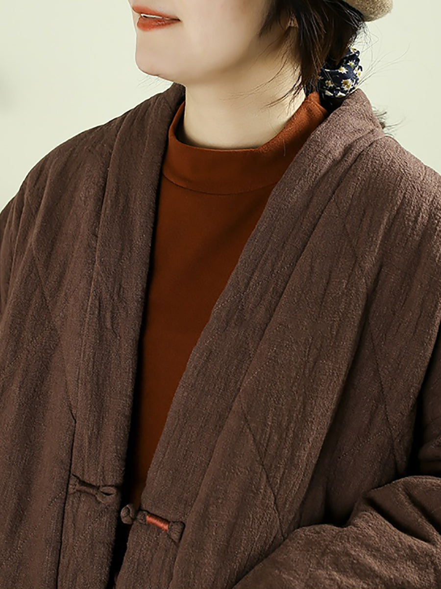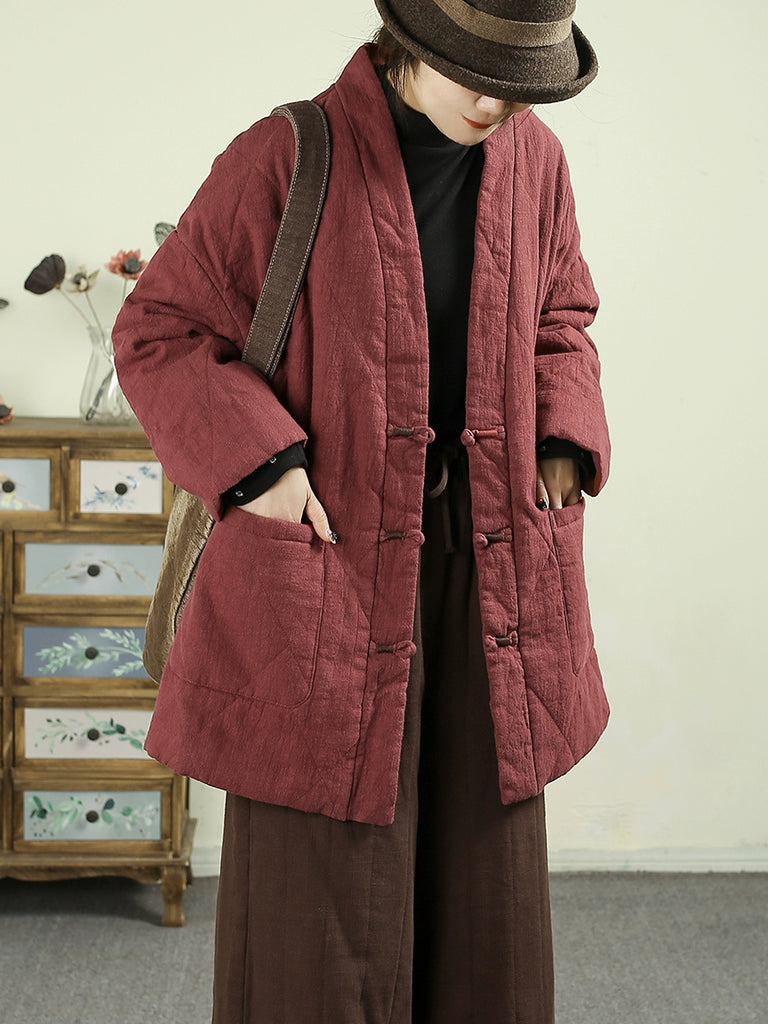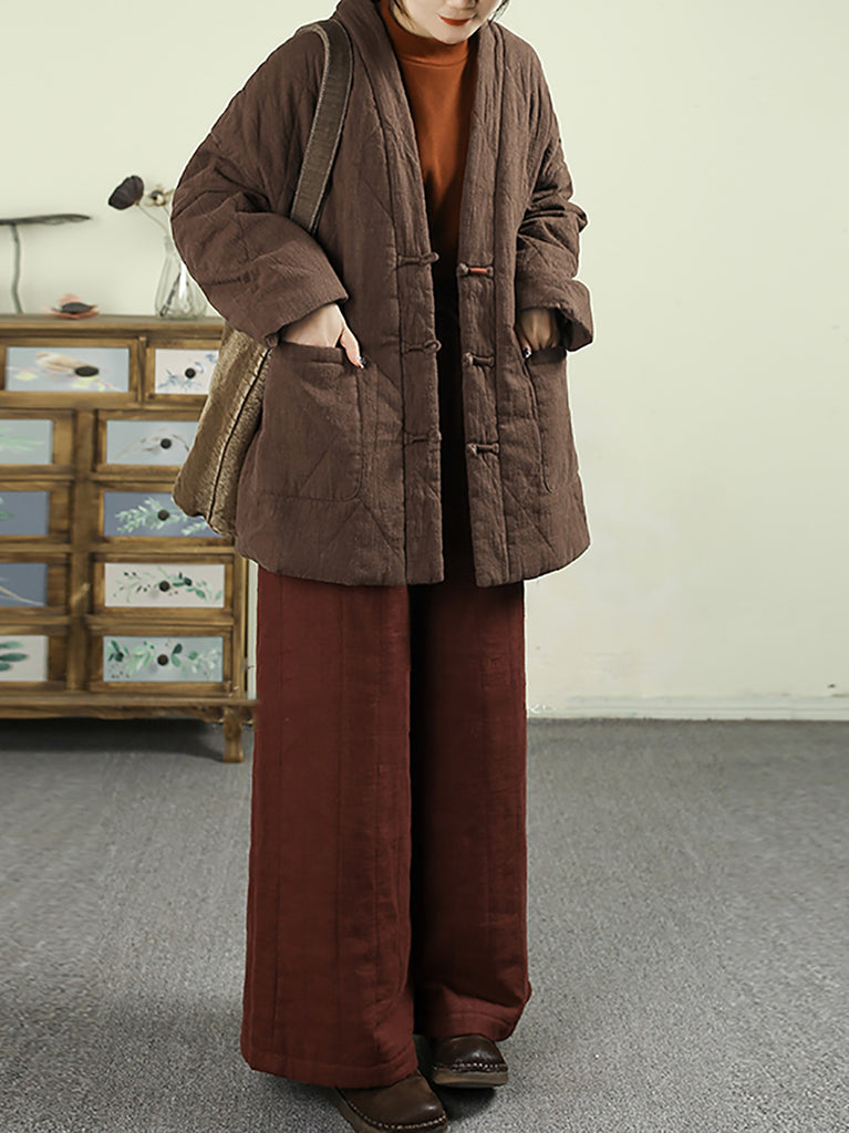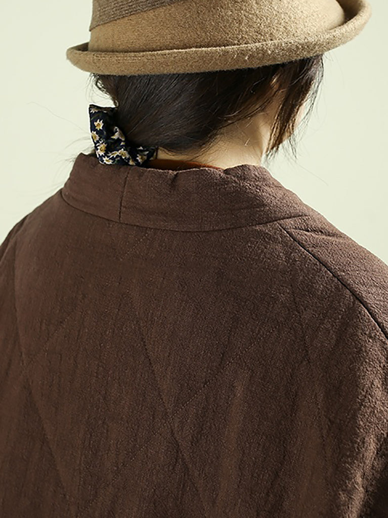 Women Winter Casual Pure Color Linen V-Neck Padded Coat