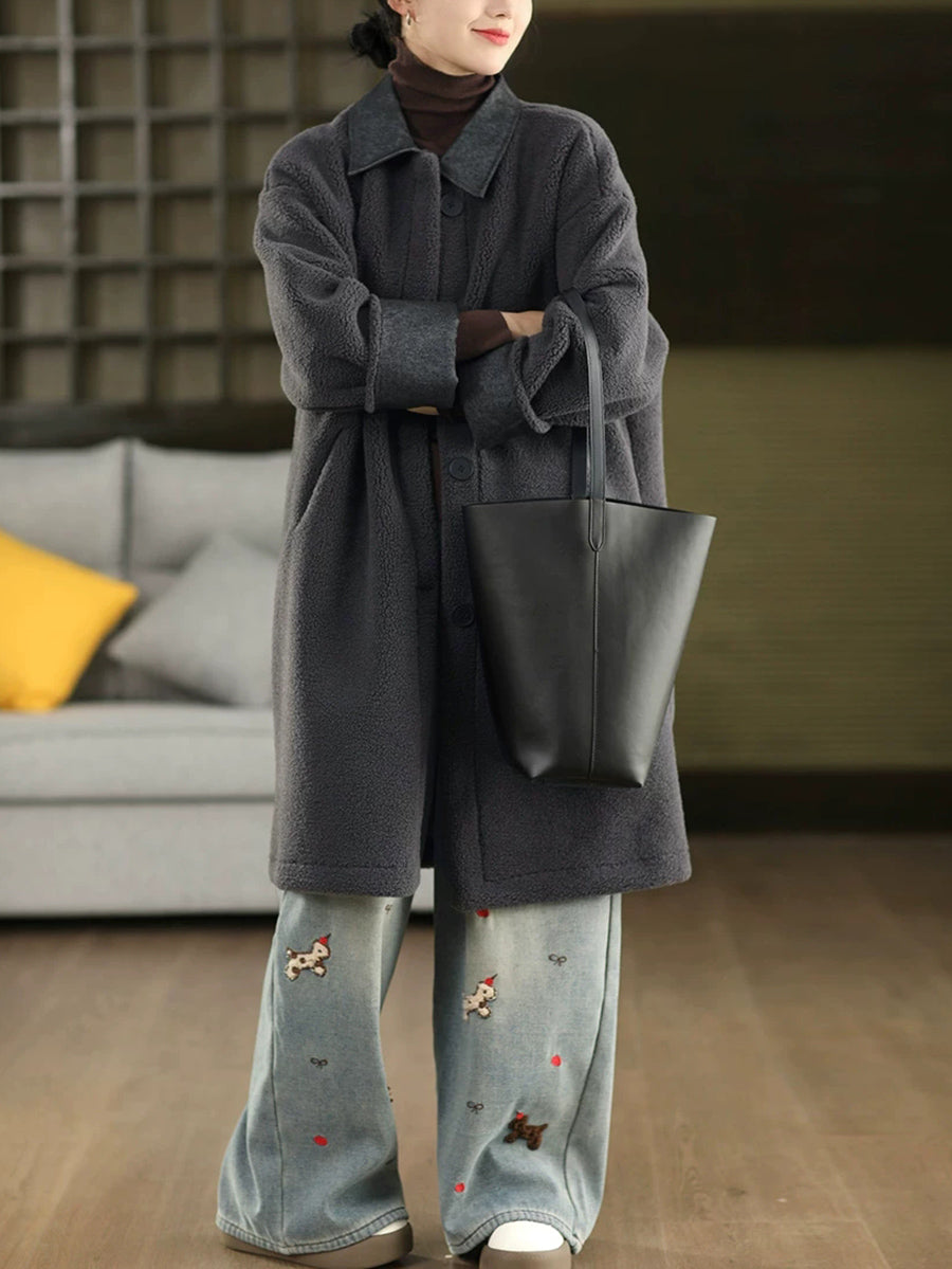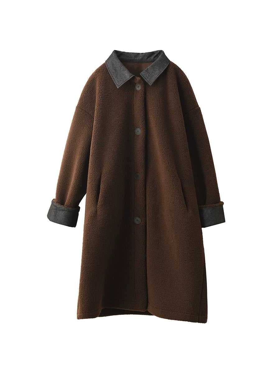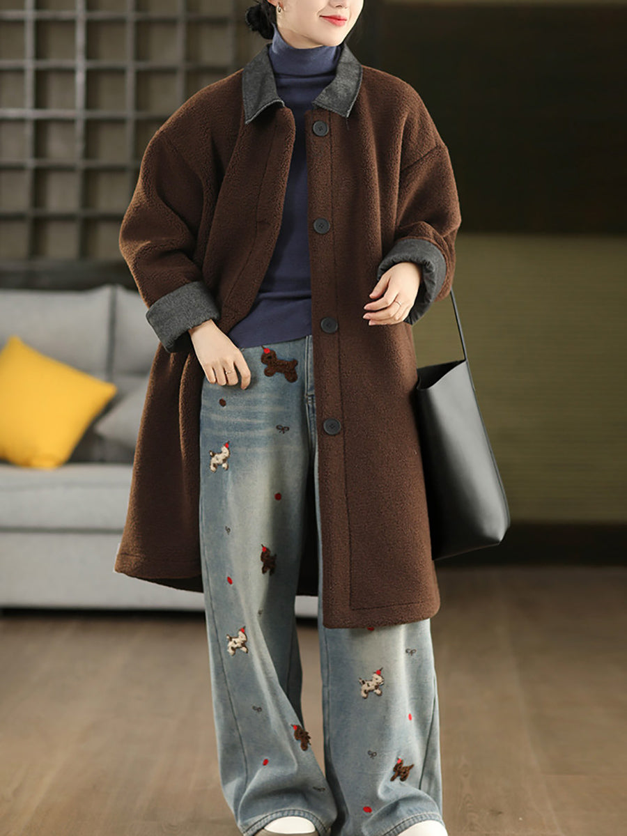 Women Winter Colorblock Turn-down Collar Fleece Coat
