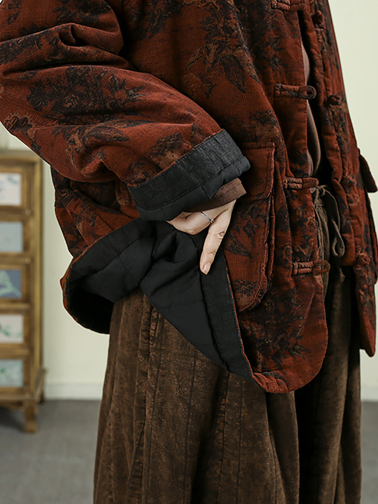 Crafted from linen, this padded coat features a floral pattern and a stand collar design. It offers full-length sleeves with a classic retro style, making it ideal for the autumn and winter seasons.