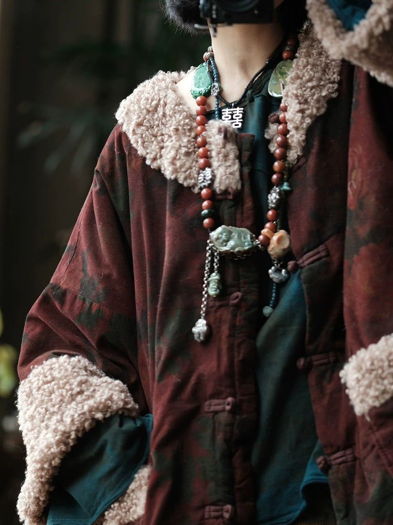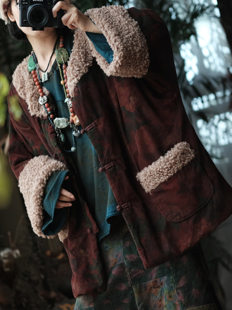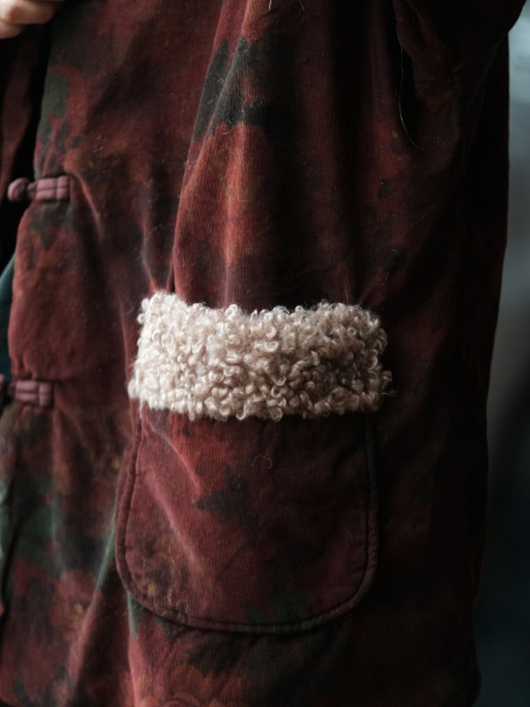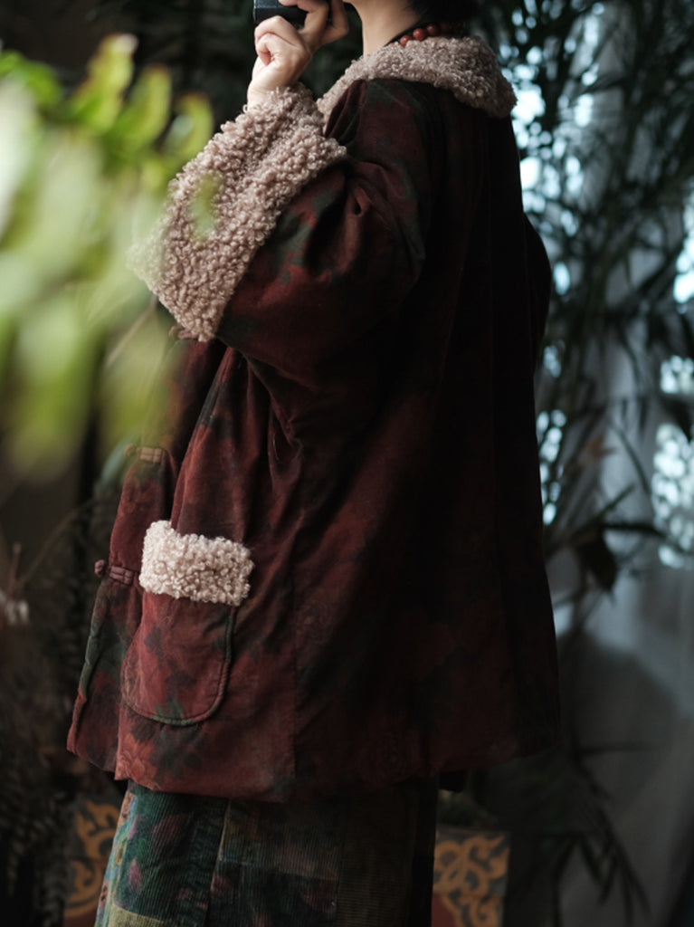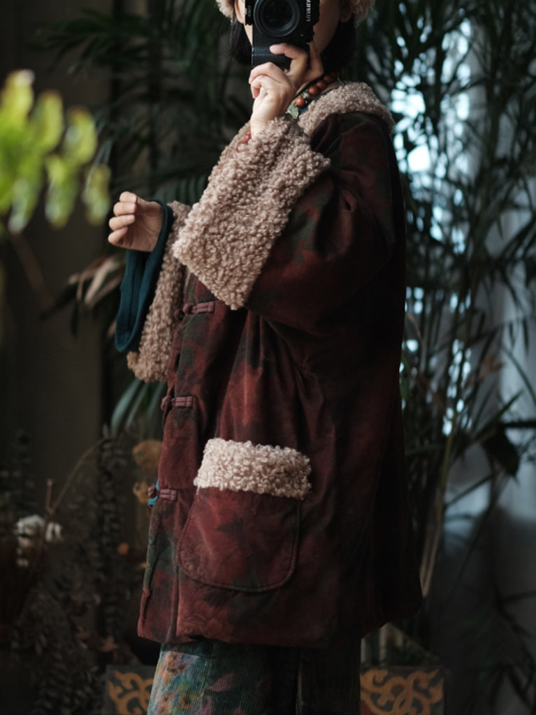 Women Winter Flower Fleece Spliced Cotton O-Neck Coat