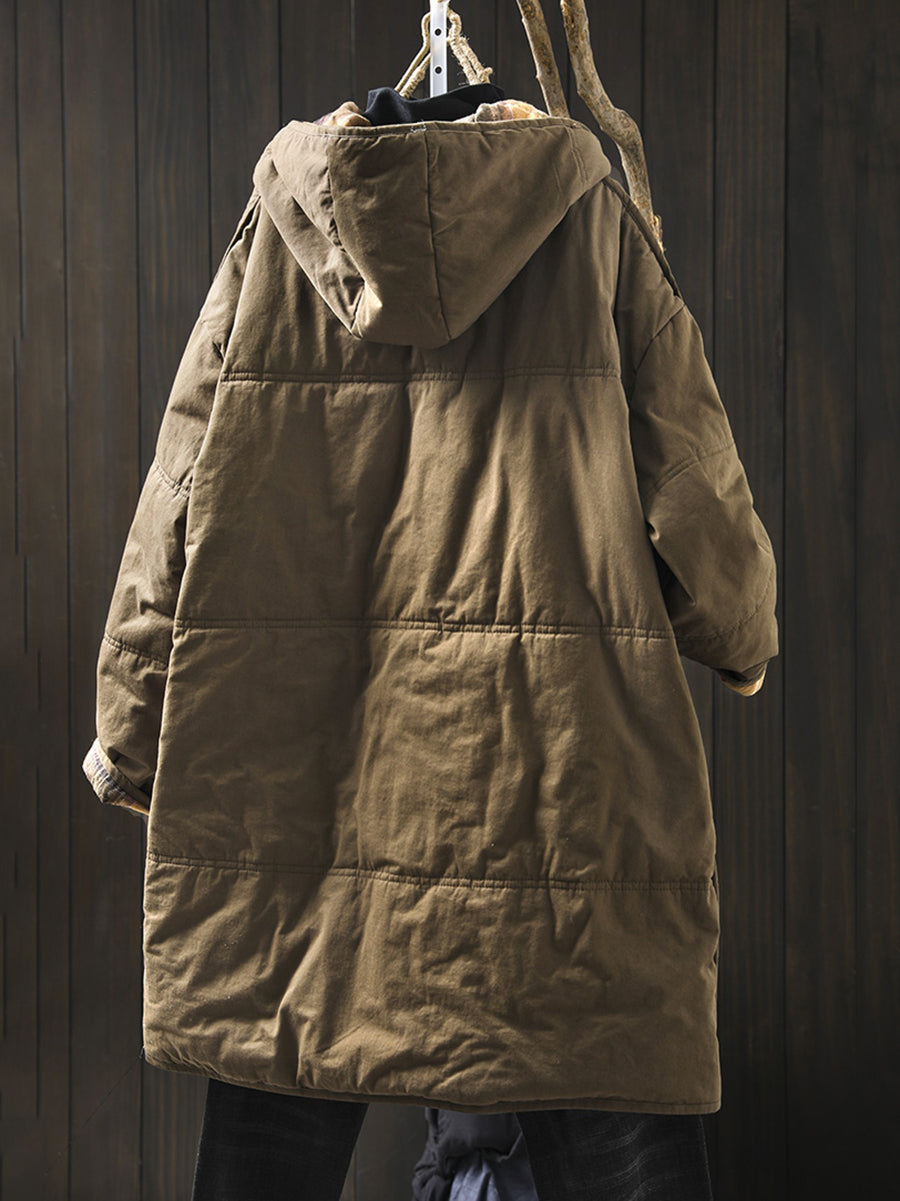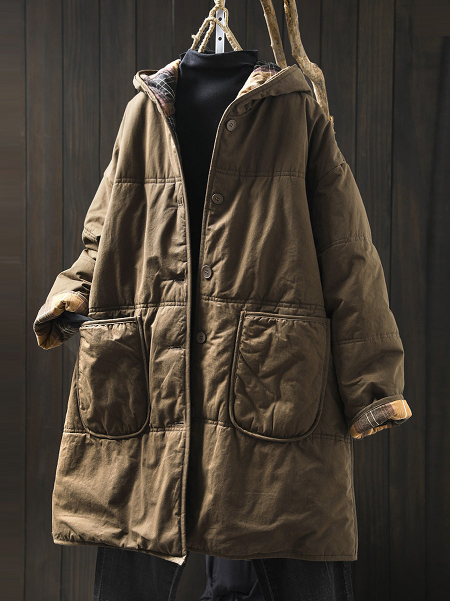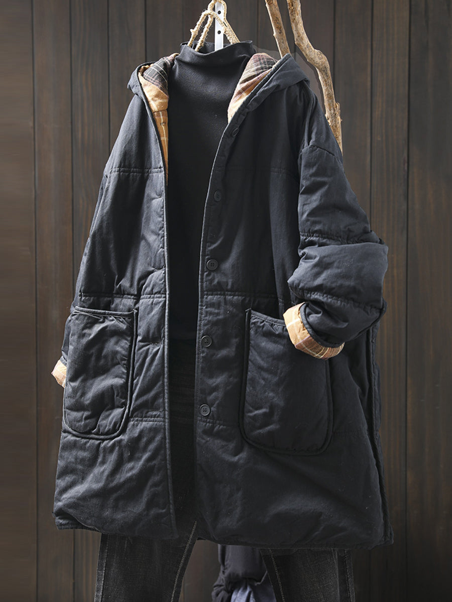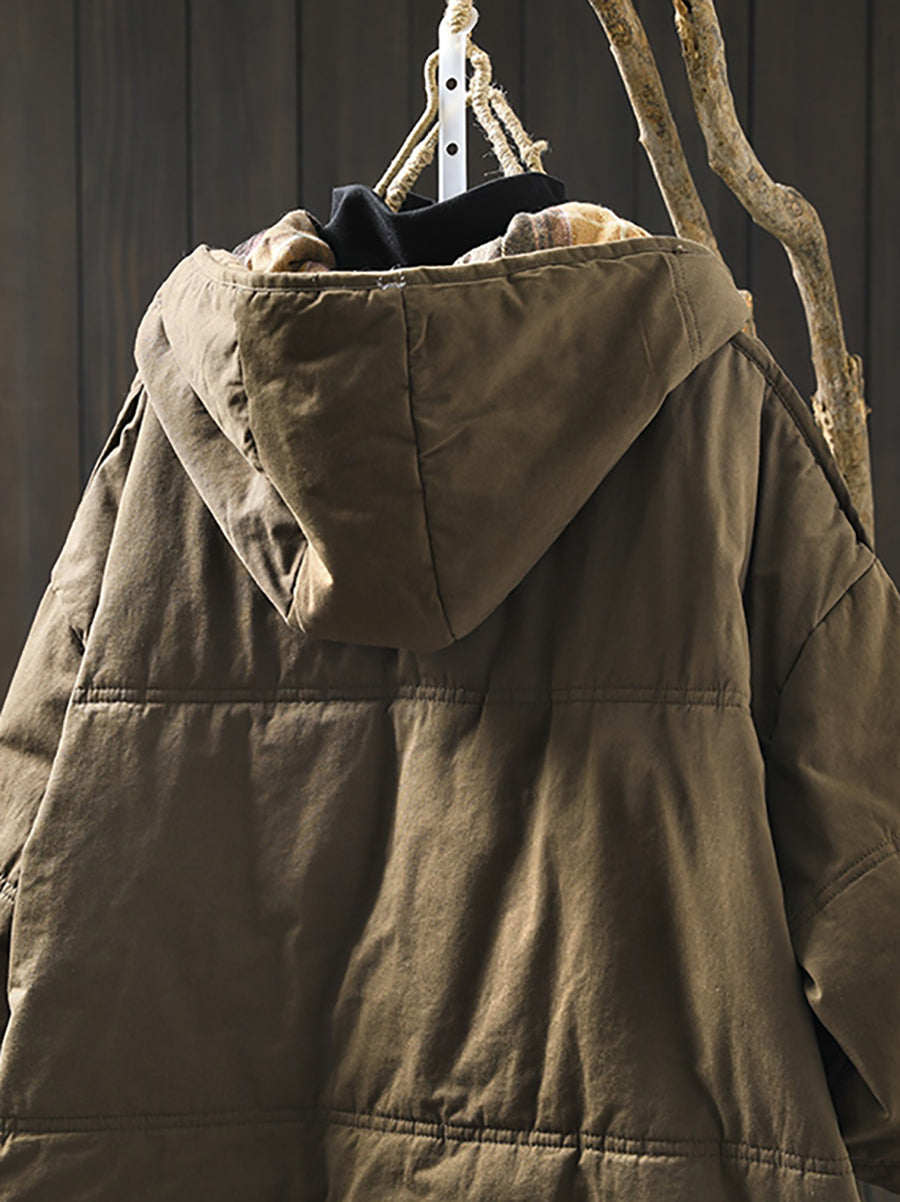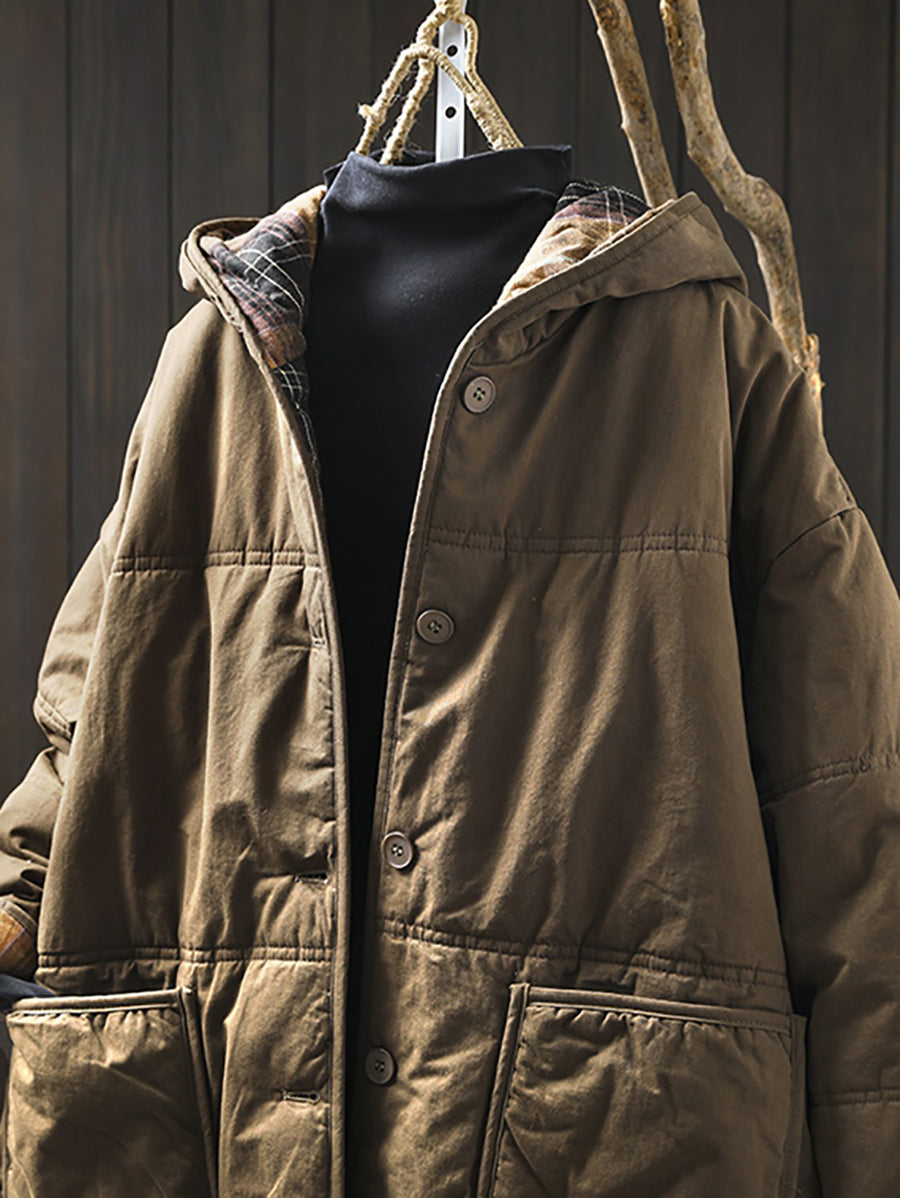 The product features a clean, solid color design, a hooded collar, and full raglan sleeves, combining classic and vintage styles, perfect for the winter and autumn seasons.