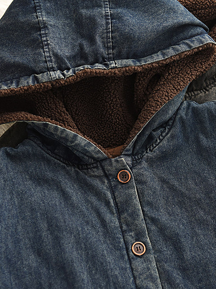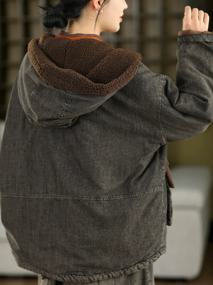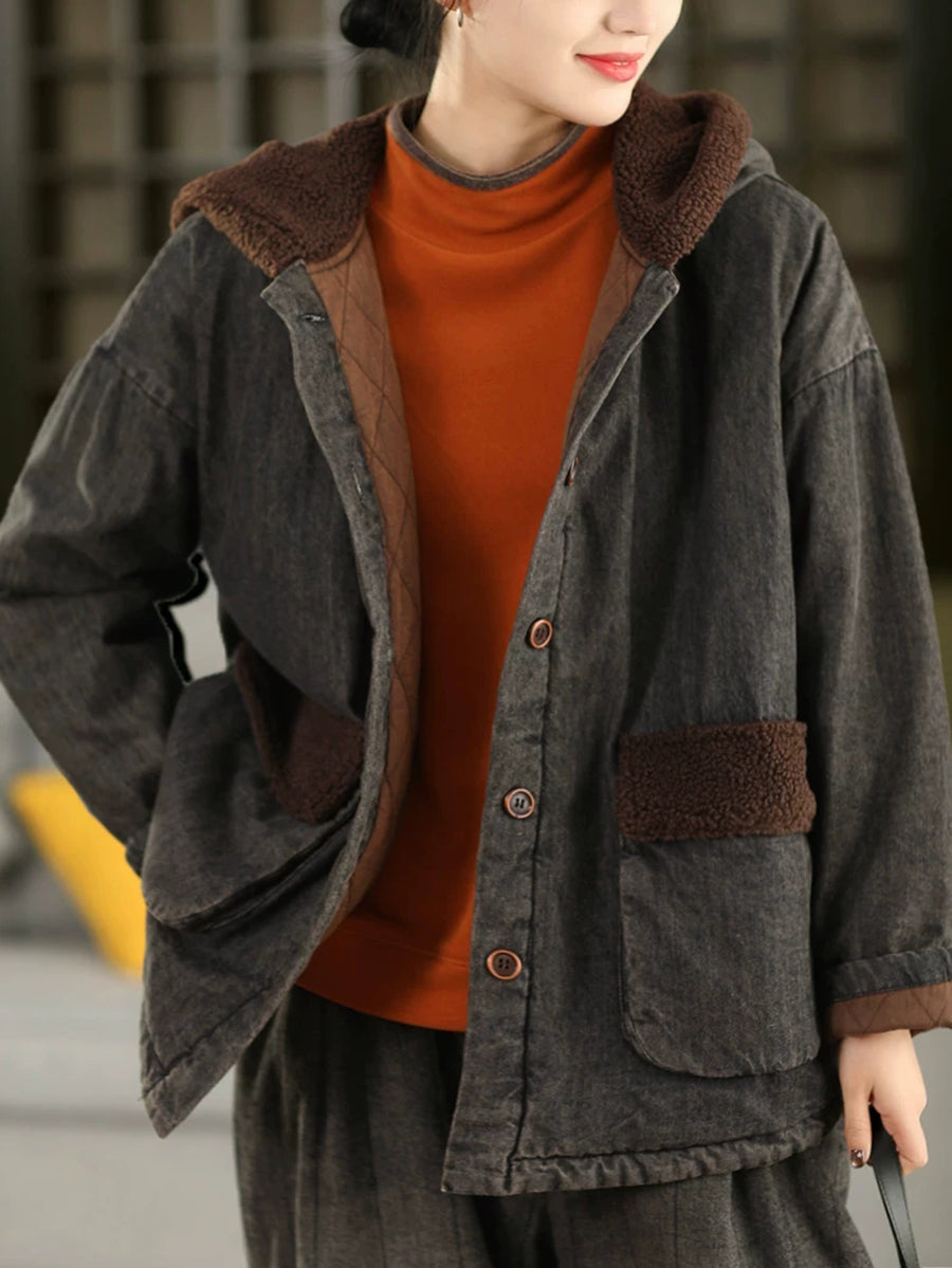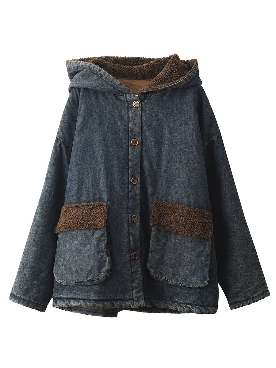 Women Winter Retro Denim Fleece Spliced Padded Hooded Coat