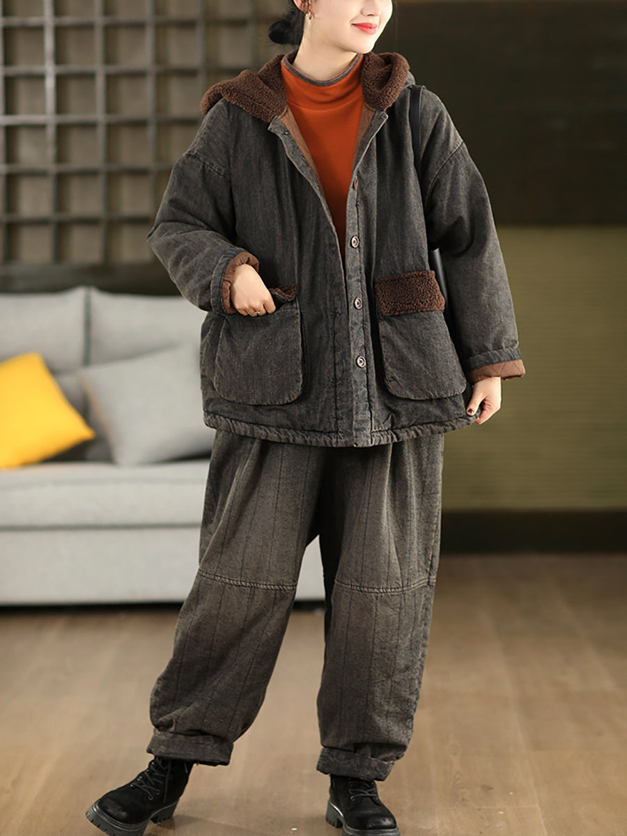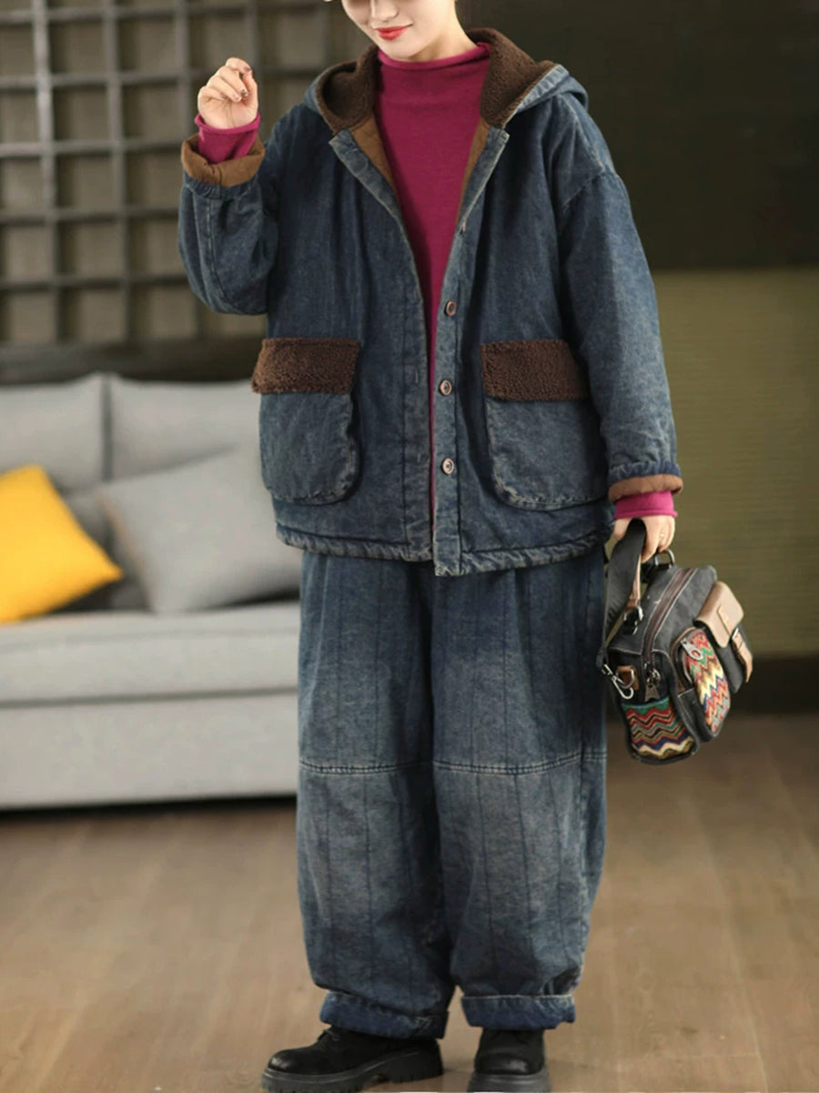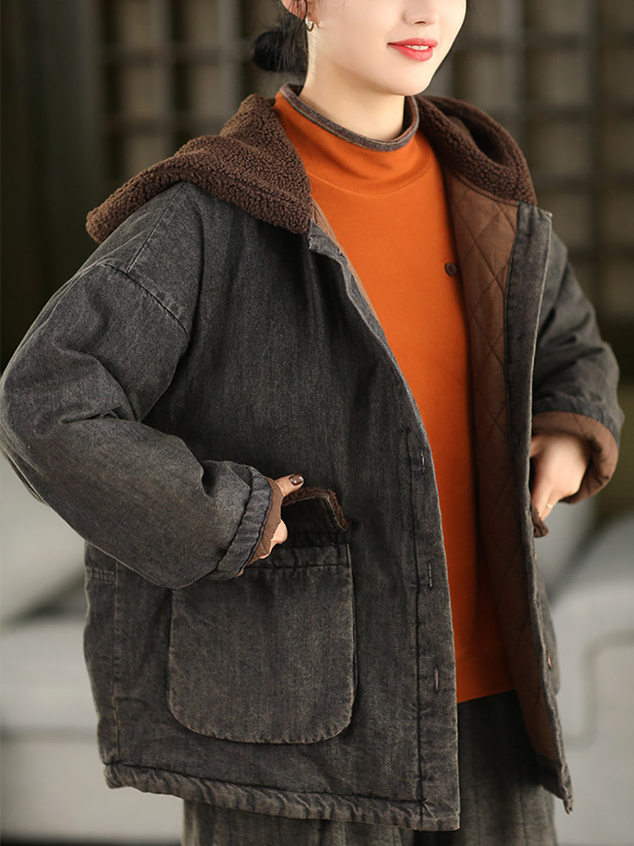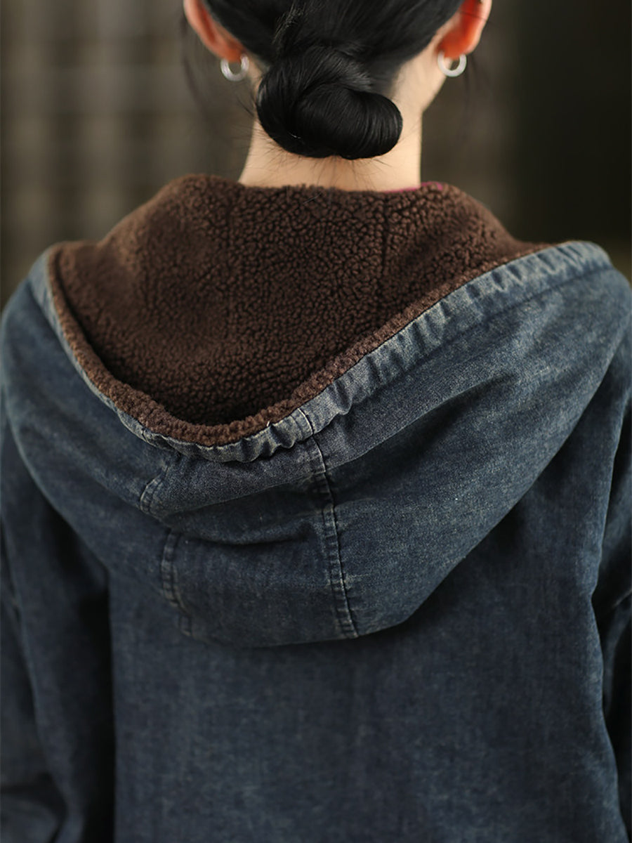 Women Winter Retro Denim Fleece Spliced Padded Hooded Coat