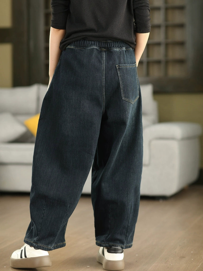 Women Winter Retro Fleece-lined Denim Harem Pants