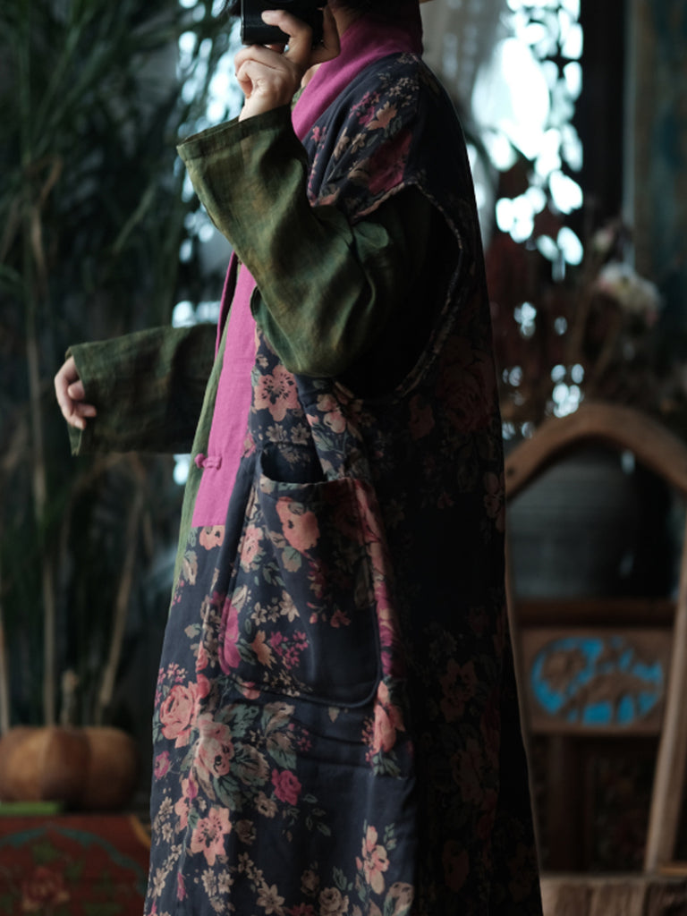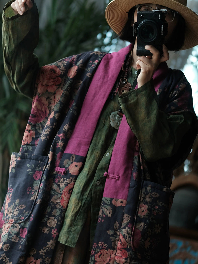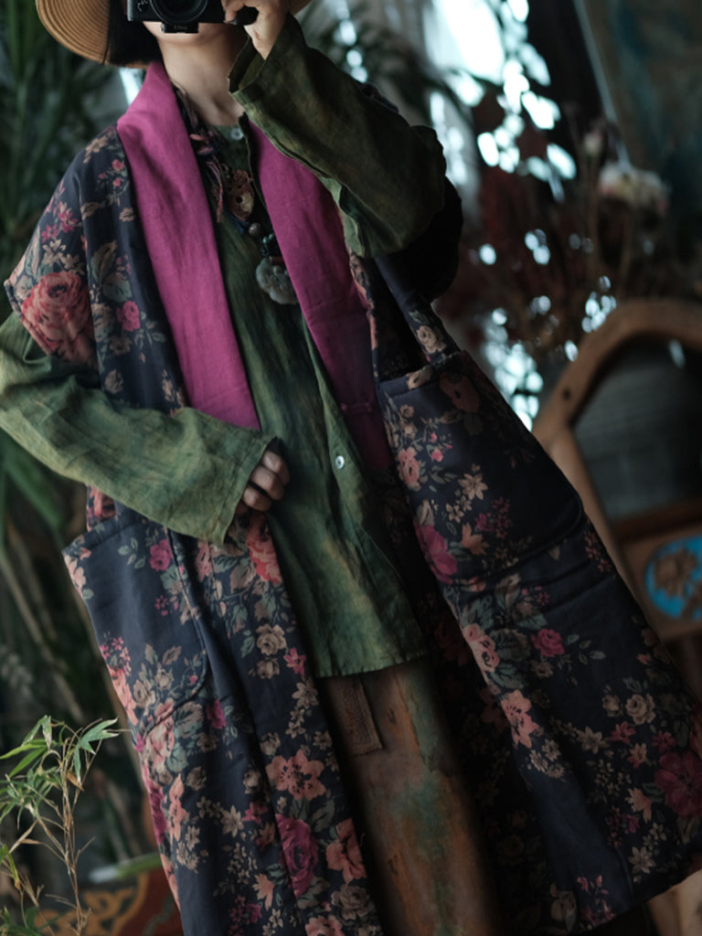 Women Winter Retro Flower Spliced V-Neck Long Vest Coat