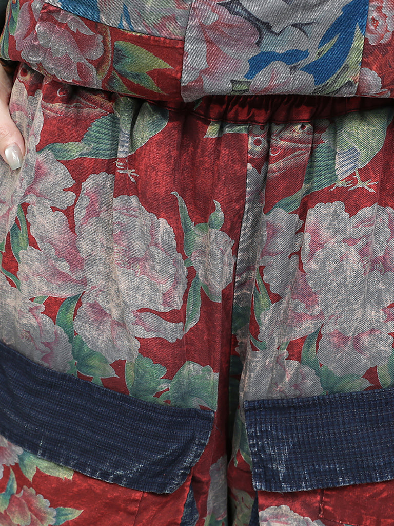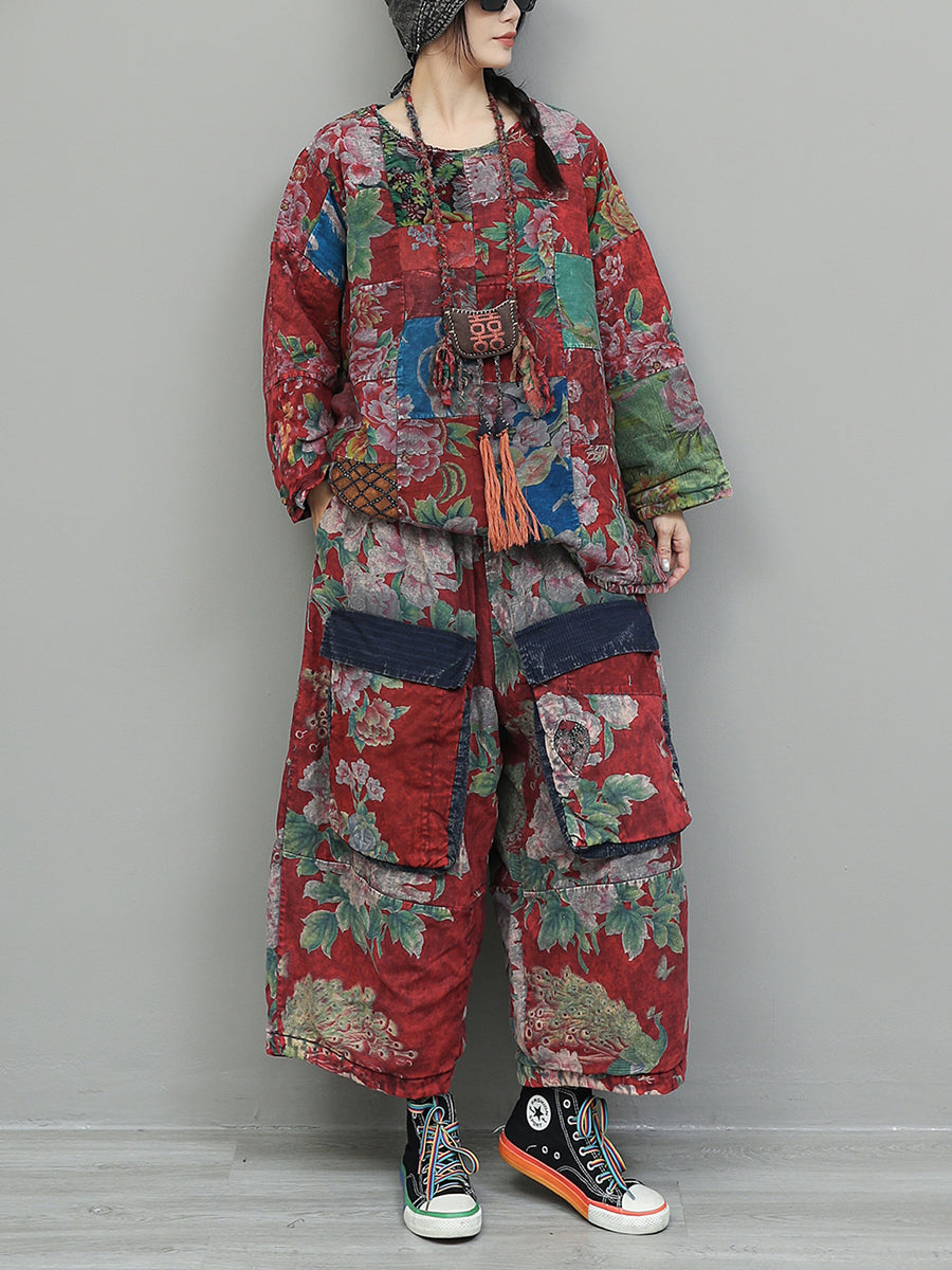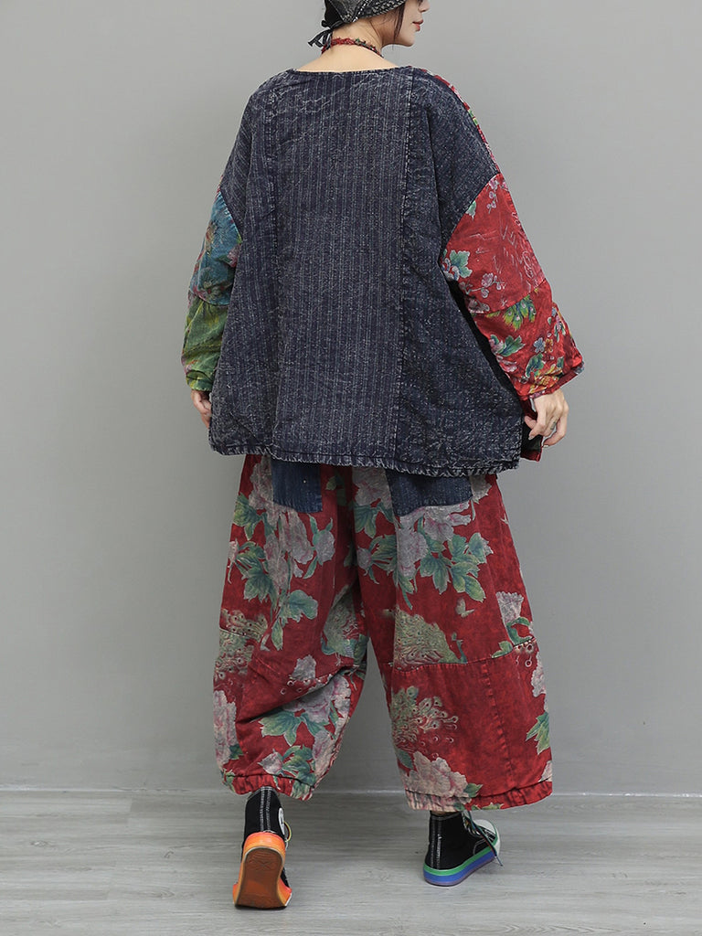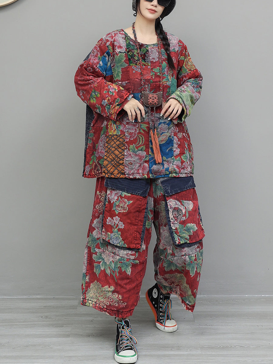 Women Winter Retro Patchwork O-Neck Padded Suits