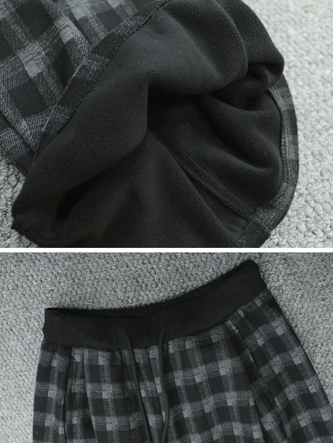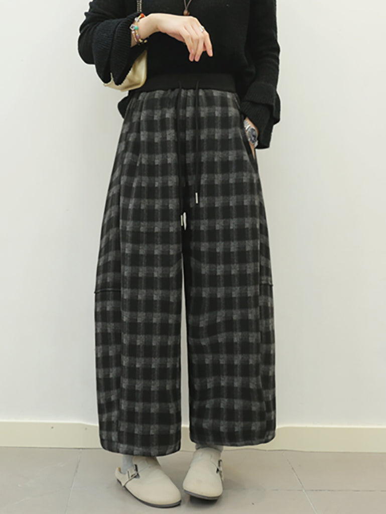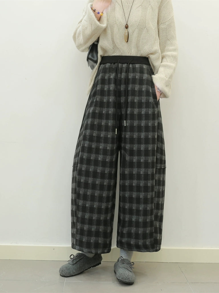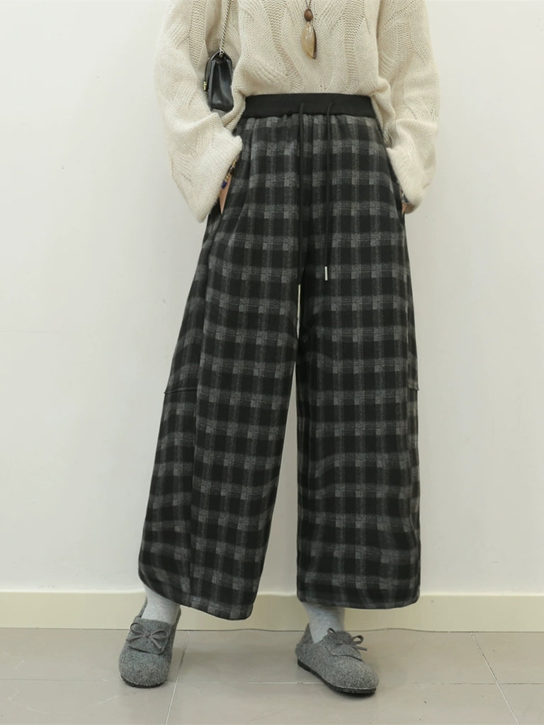Women Winter Retro Plaid Fleece-lined Wide-leg Pants