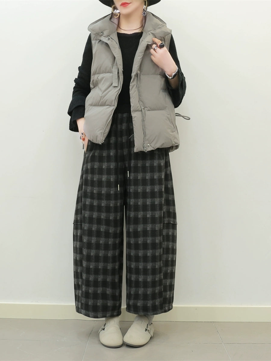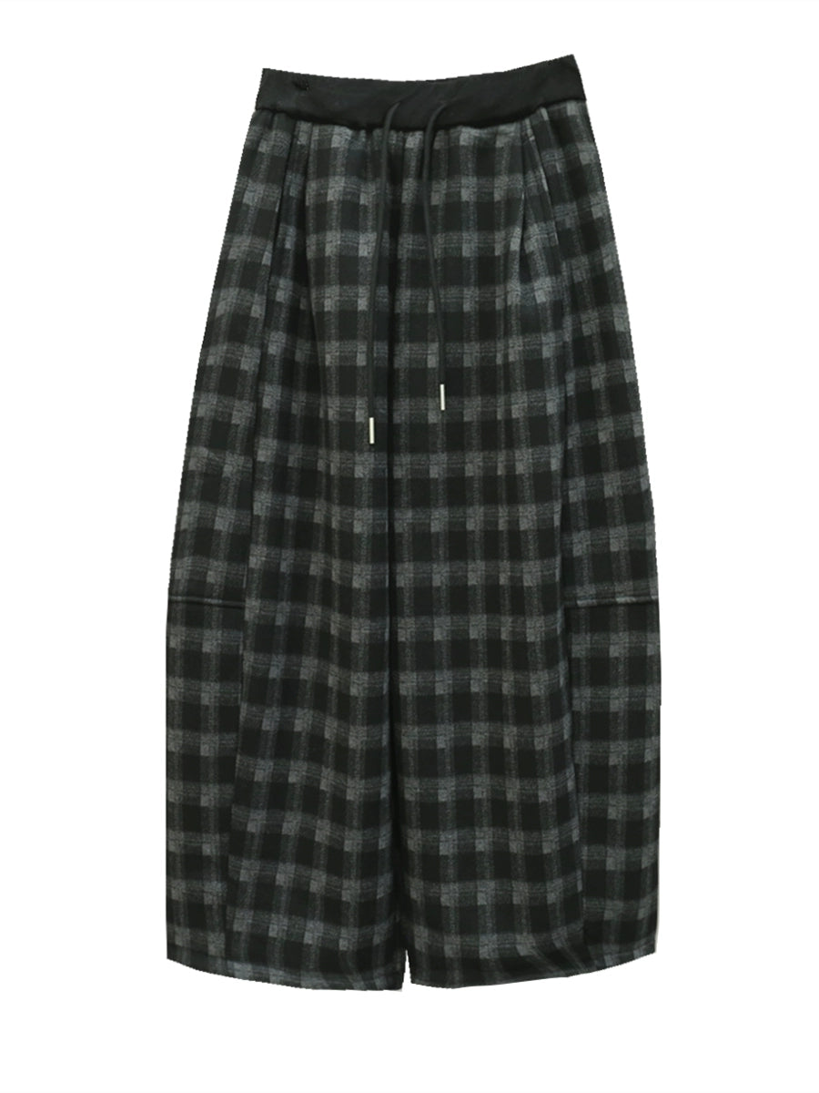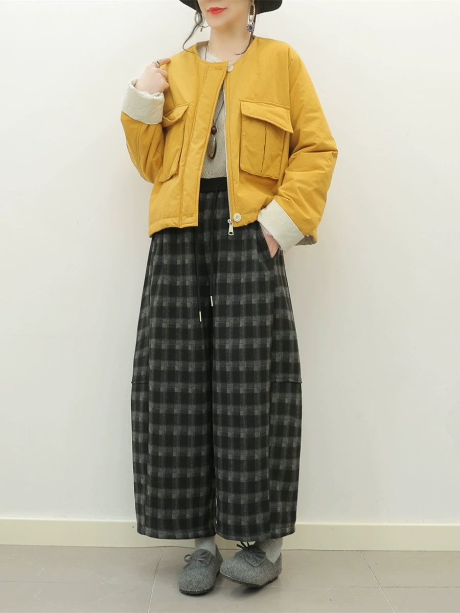 Women Winter Retro Plaid Fleece-lined Wide-leg Pants