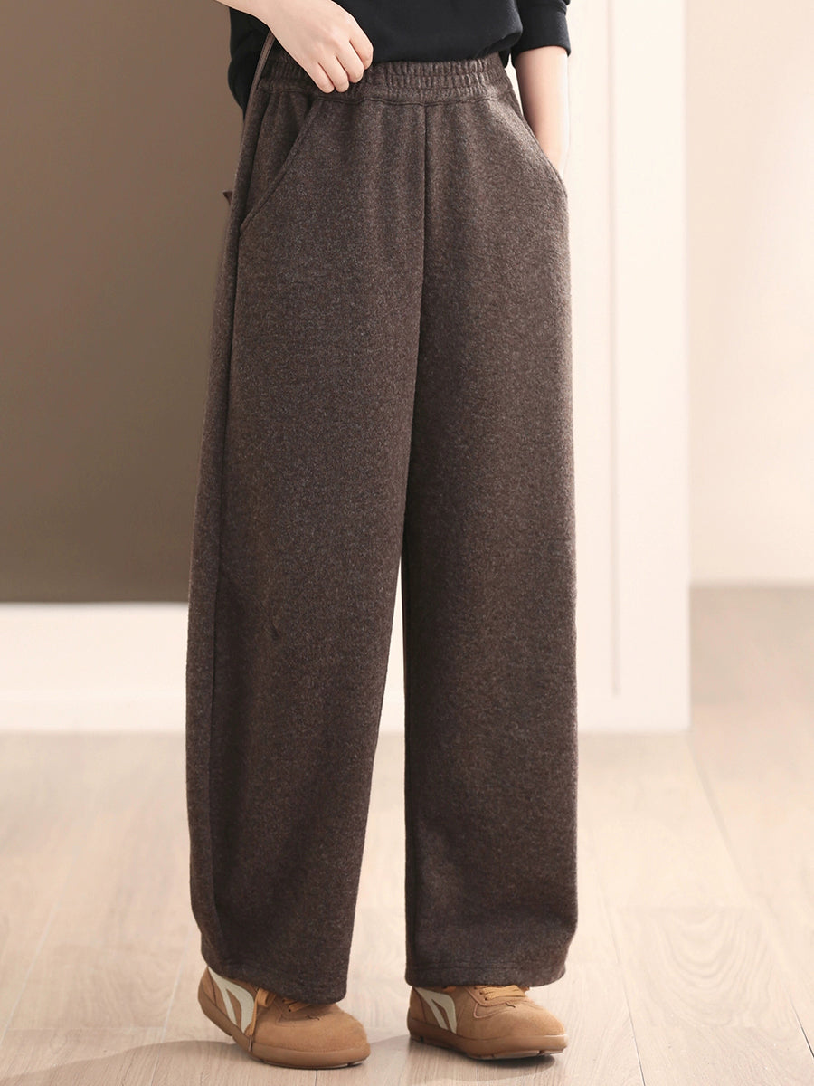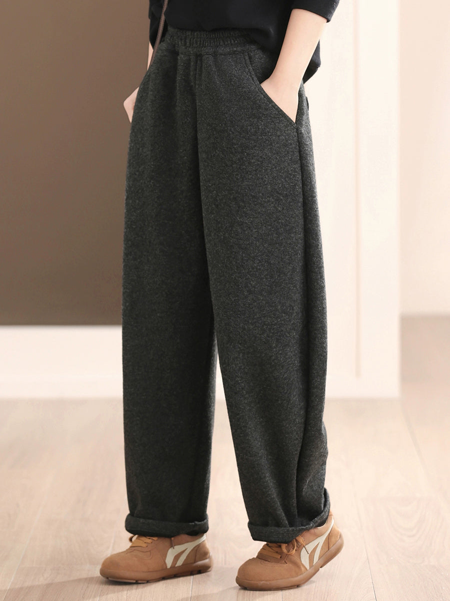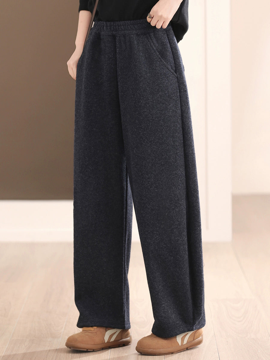 Women Winter Retro Pure Color Fleece-lined Wide-leg Pants