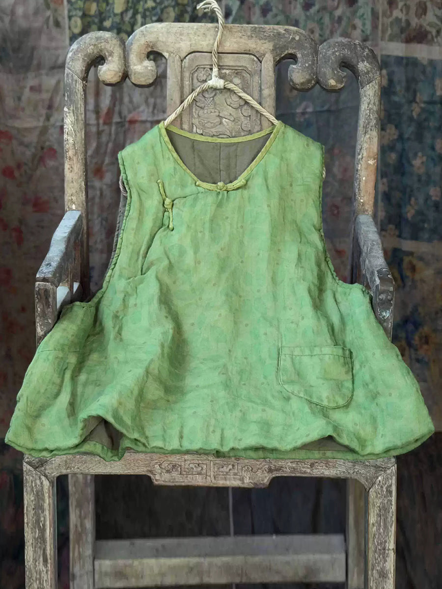 Women Winter Retro Flower O-Neck Ramie Padded Vest