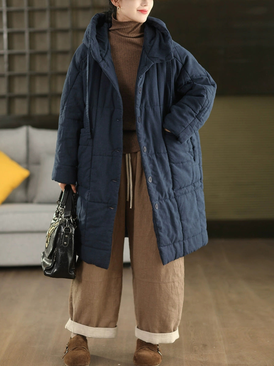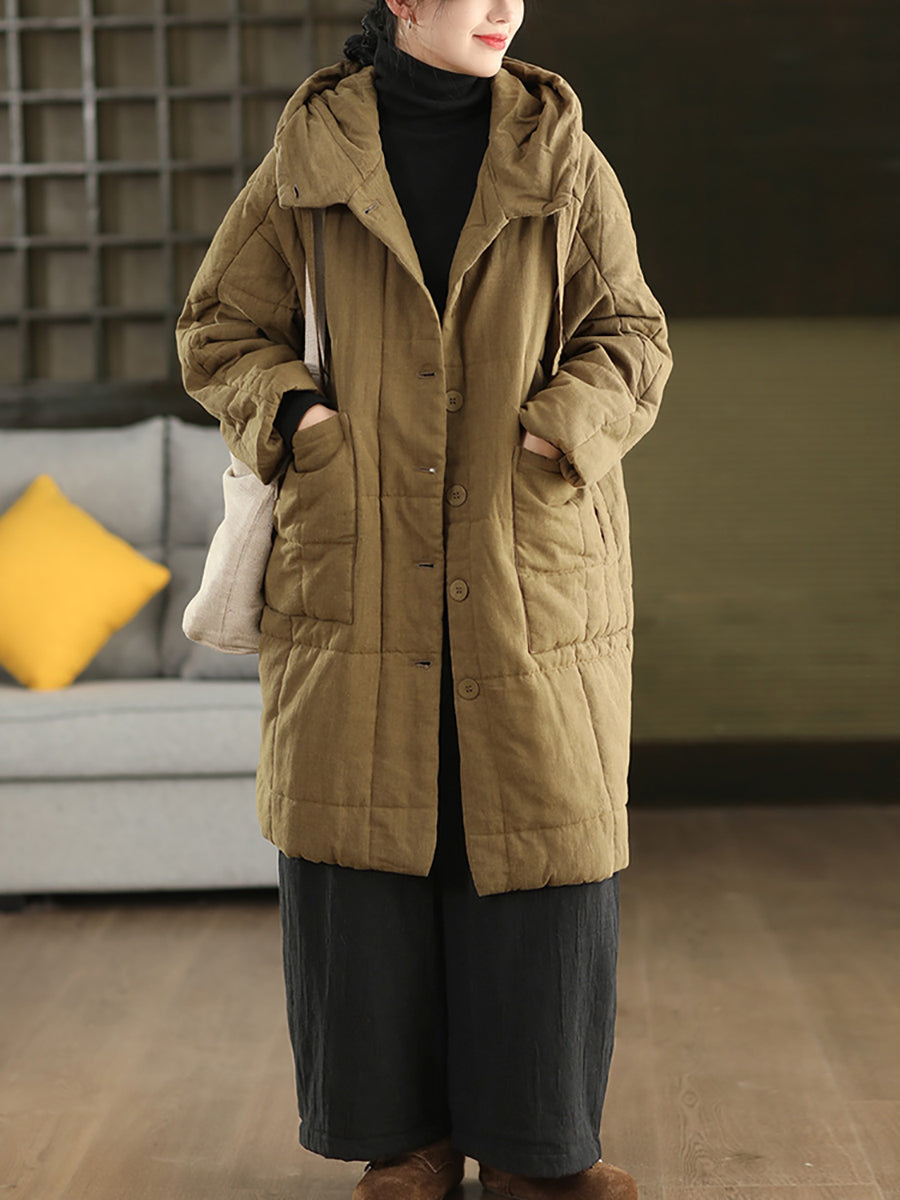 Women Winter Retro Ramie Hooded Padded Coat