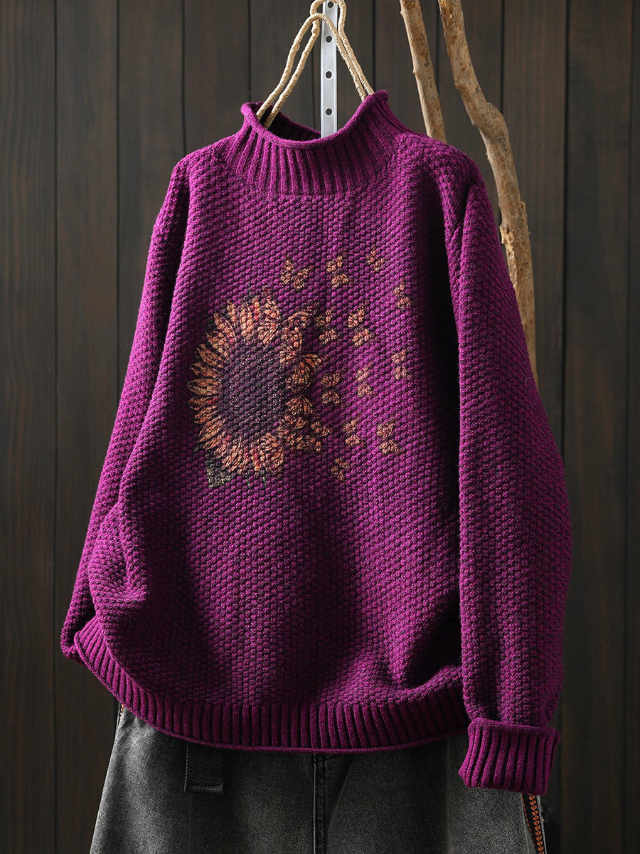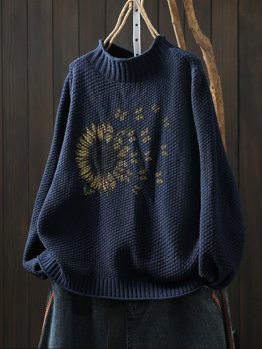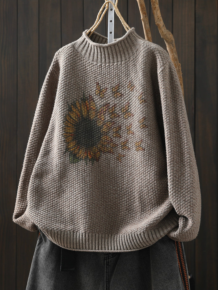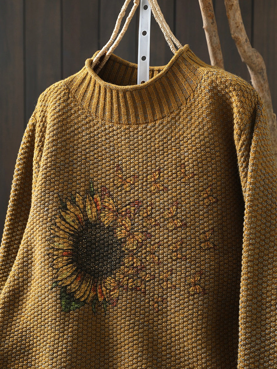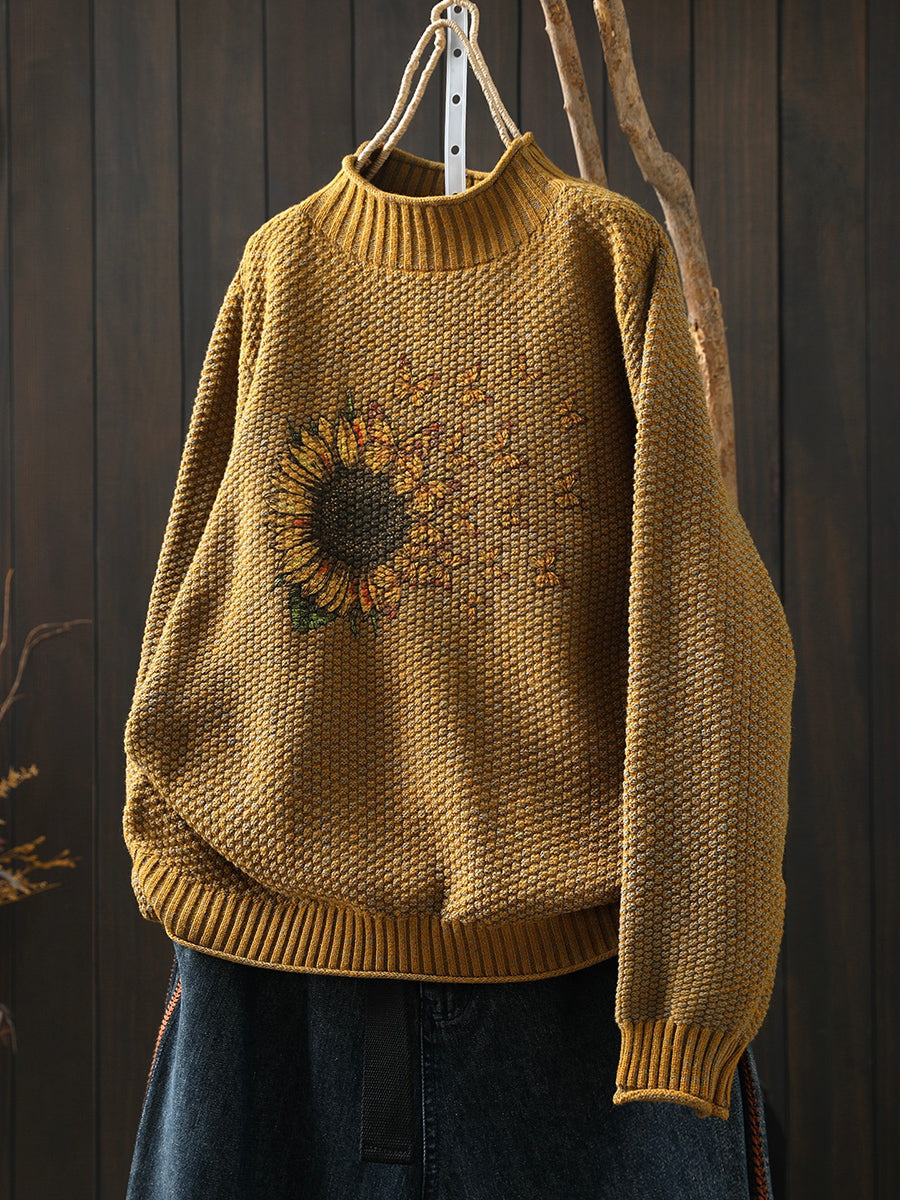 Women Winter Sunflower Knitted Half-turtleneck Sweater
