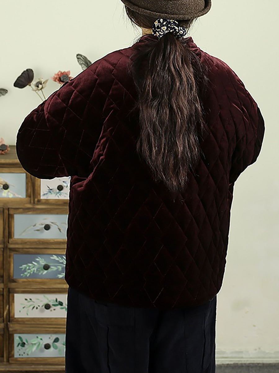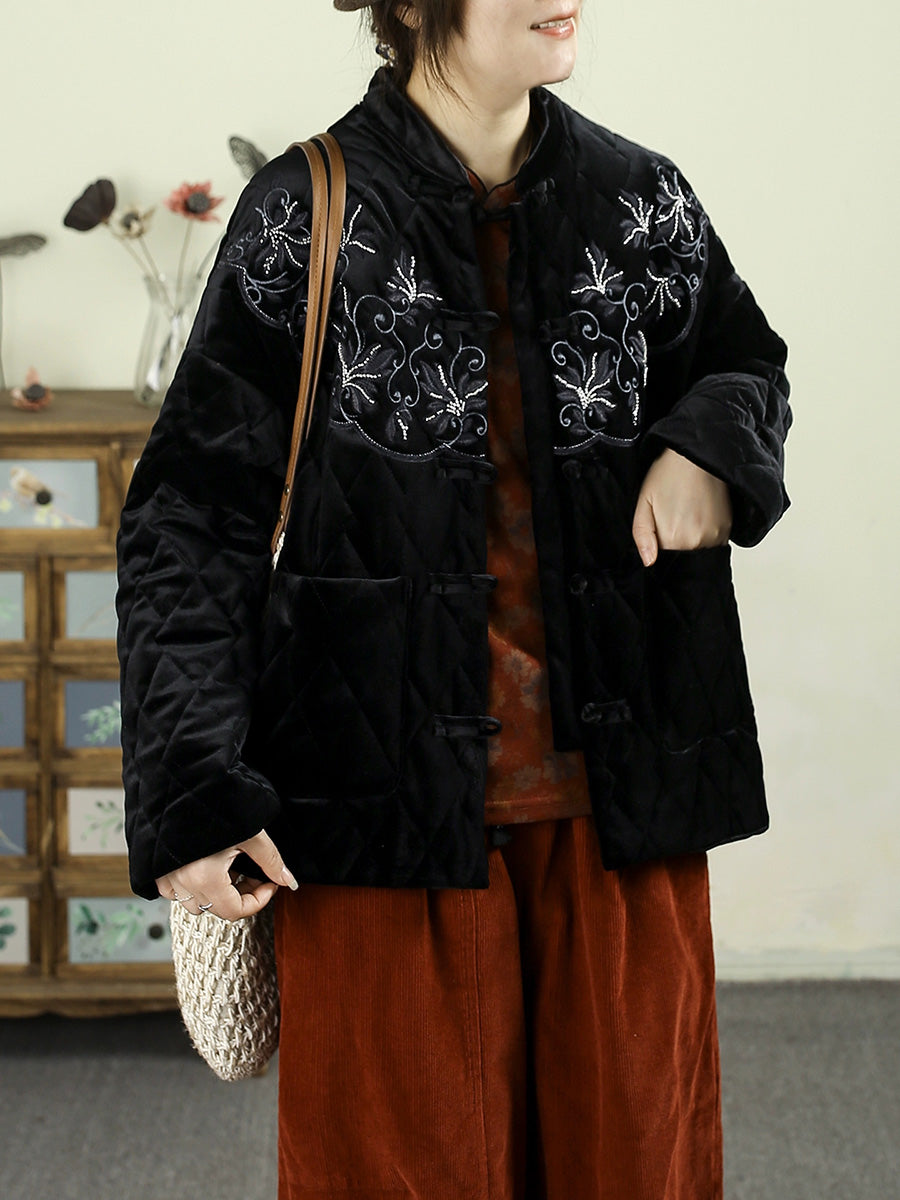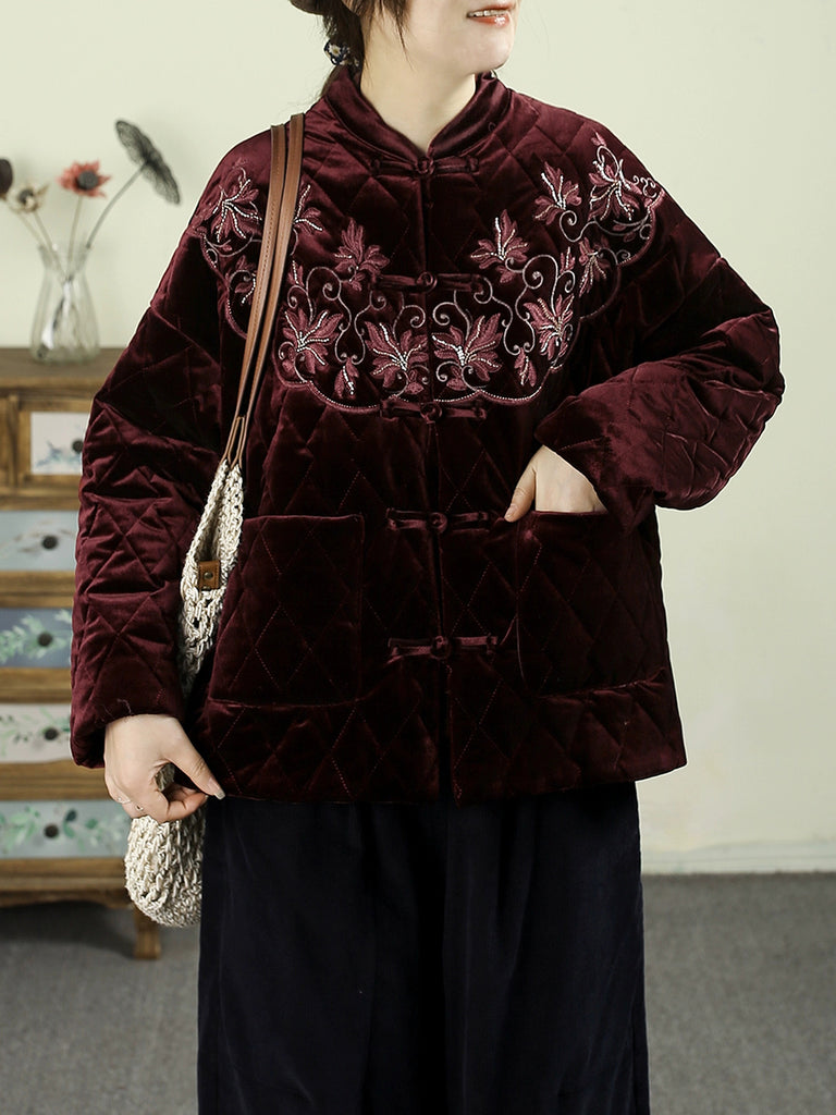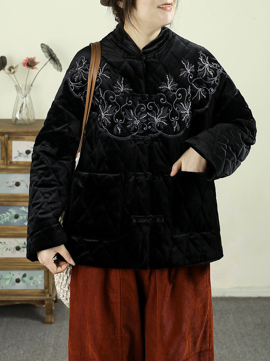 Women Winter Vintage Embroidery Padded Stand Collar Jacket