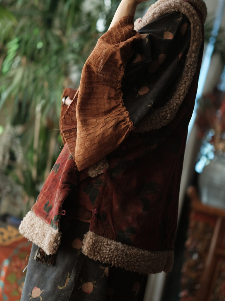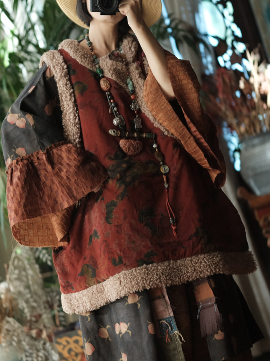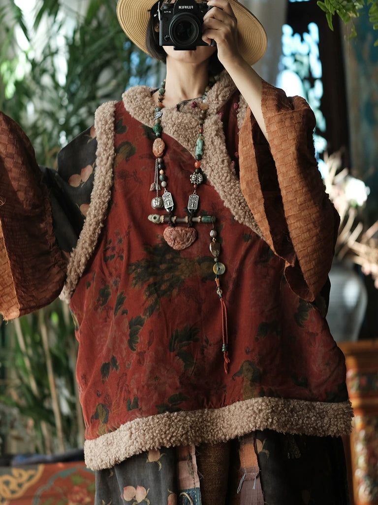 Women Winter Vintage Flower Fleece Spliced Padded Vest