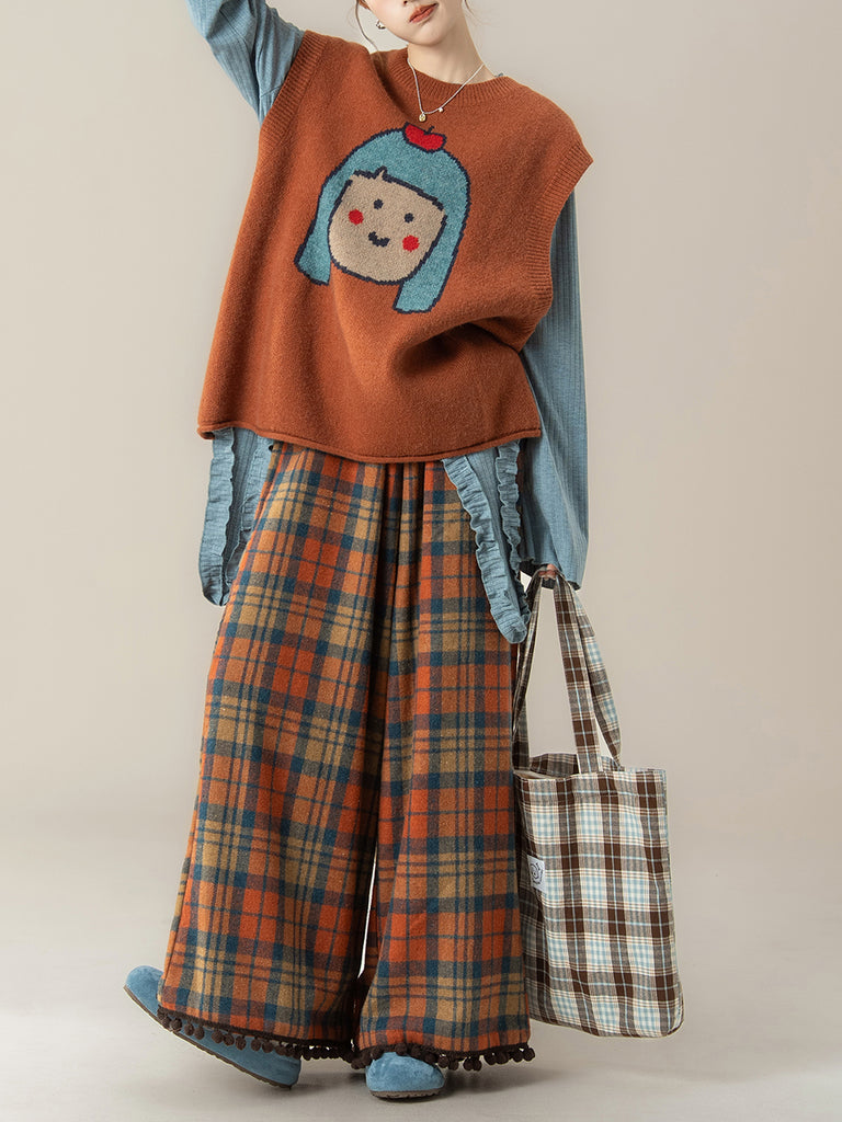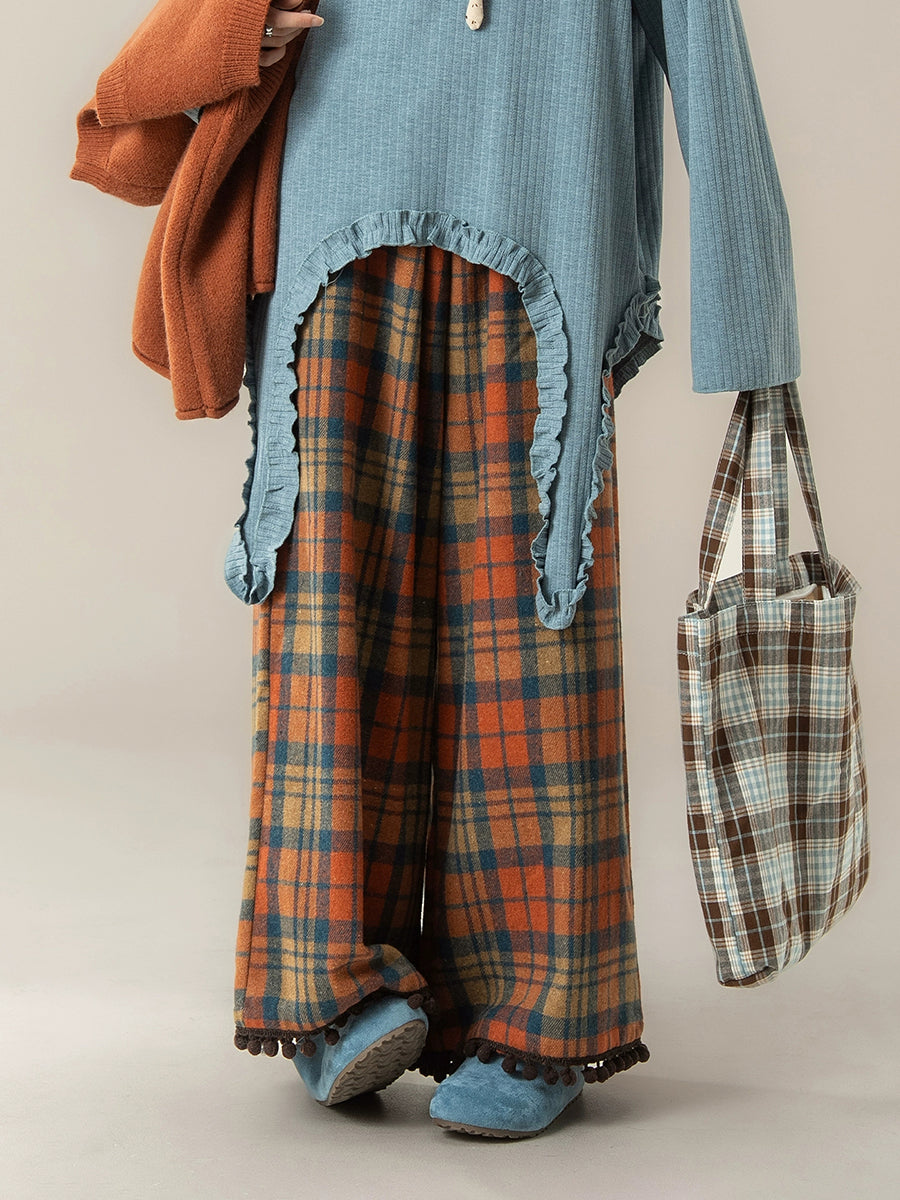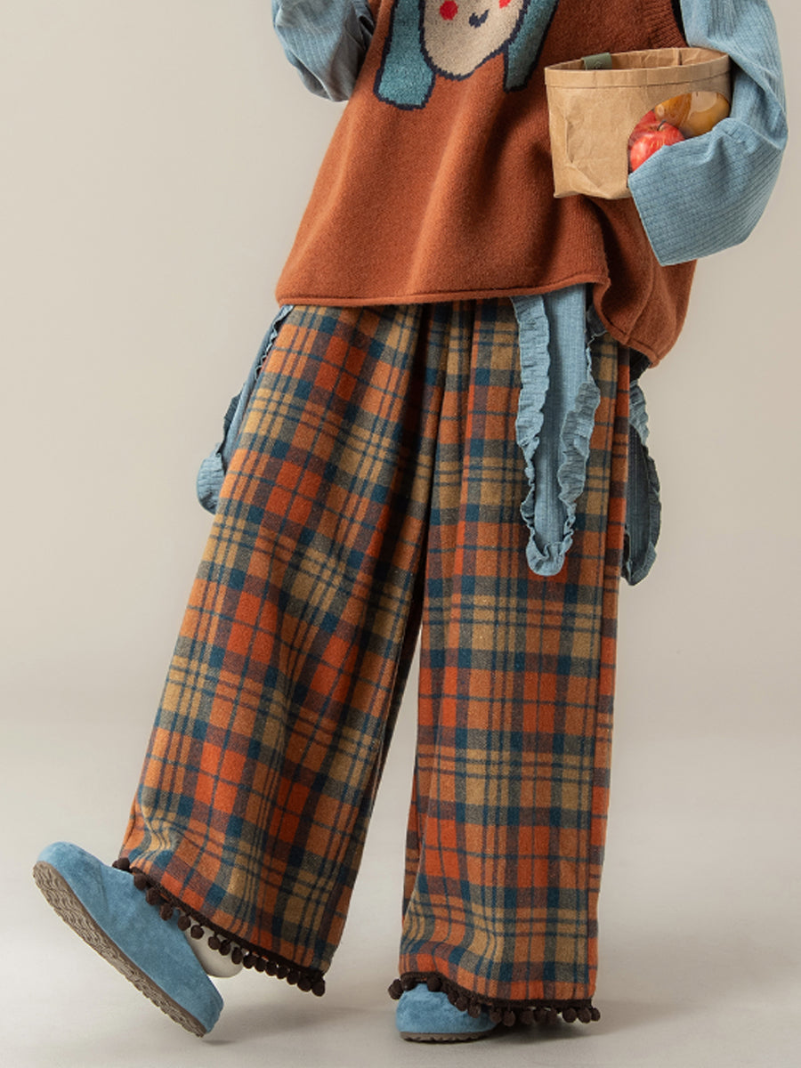 Women Winter Vintage Plaid Tassel Hem Wide-leg Pants