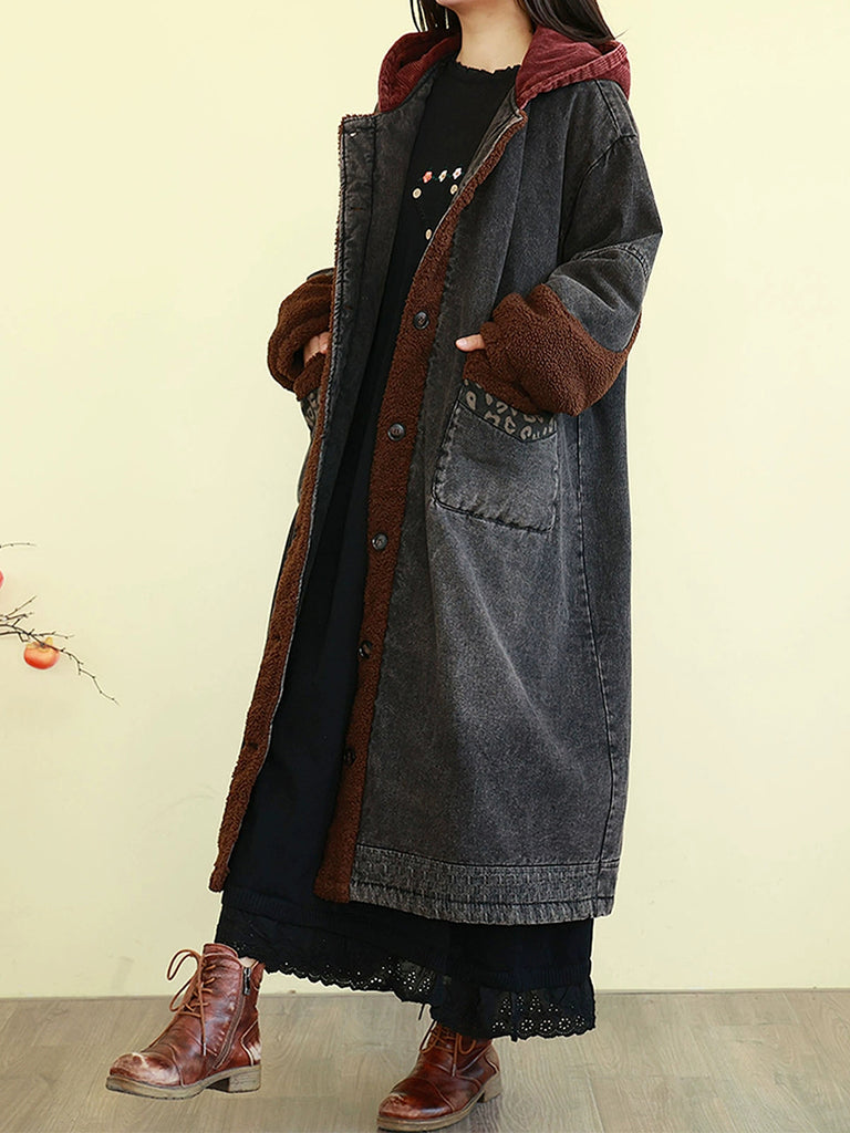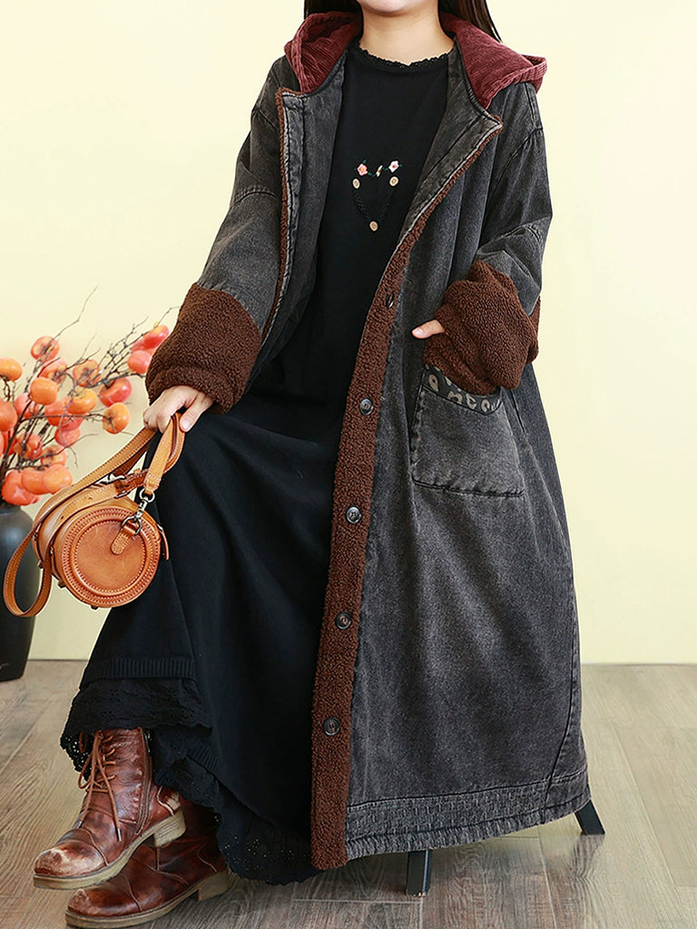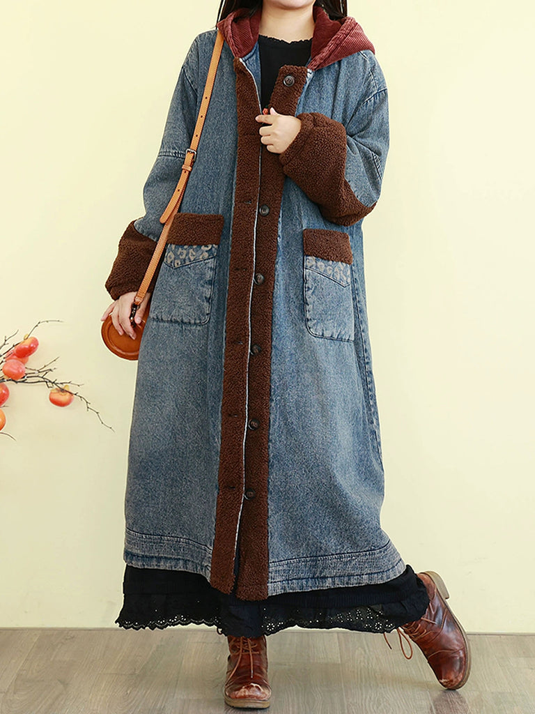 Women Winter Vintage Spliced Denim Padded Hooded Coat